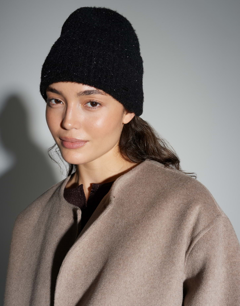 Kuscheliger Strick trifft auf subtilen Glanz im Festtagslook. Die Mütze schenkt angenehme Wärme und setzt zugleich ein Highlight in der Winterzeit.