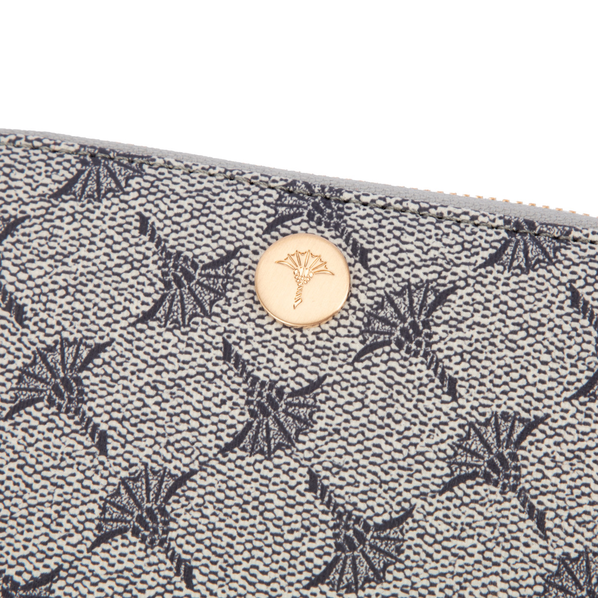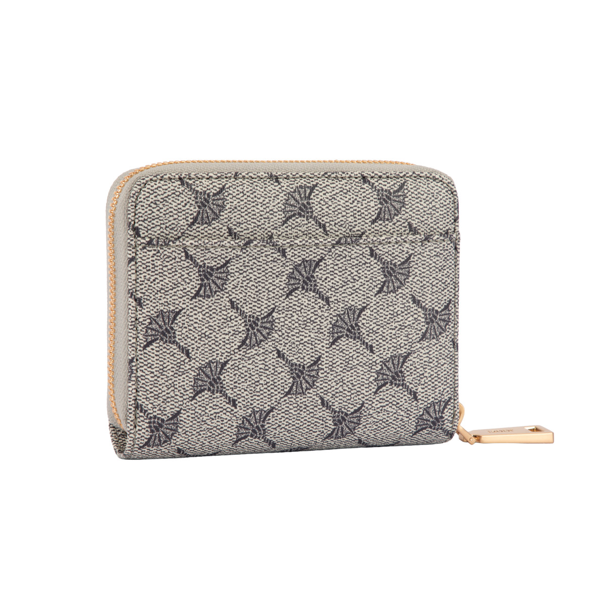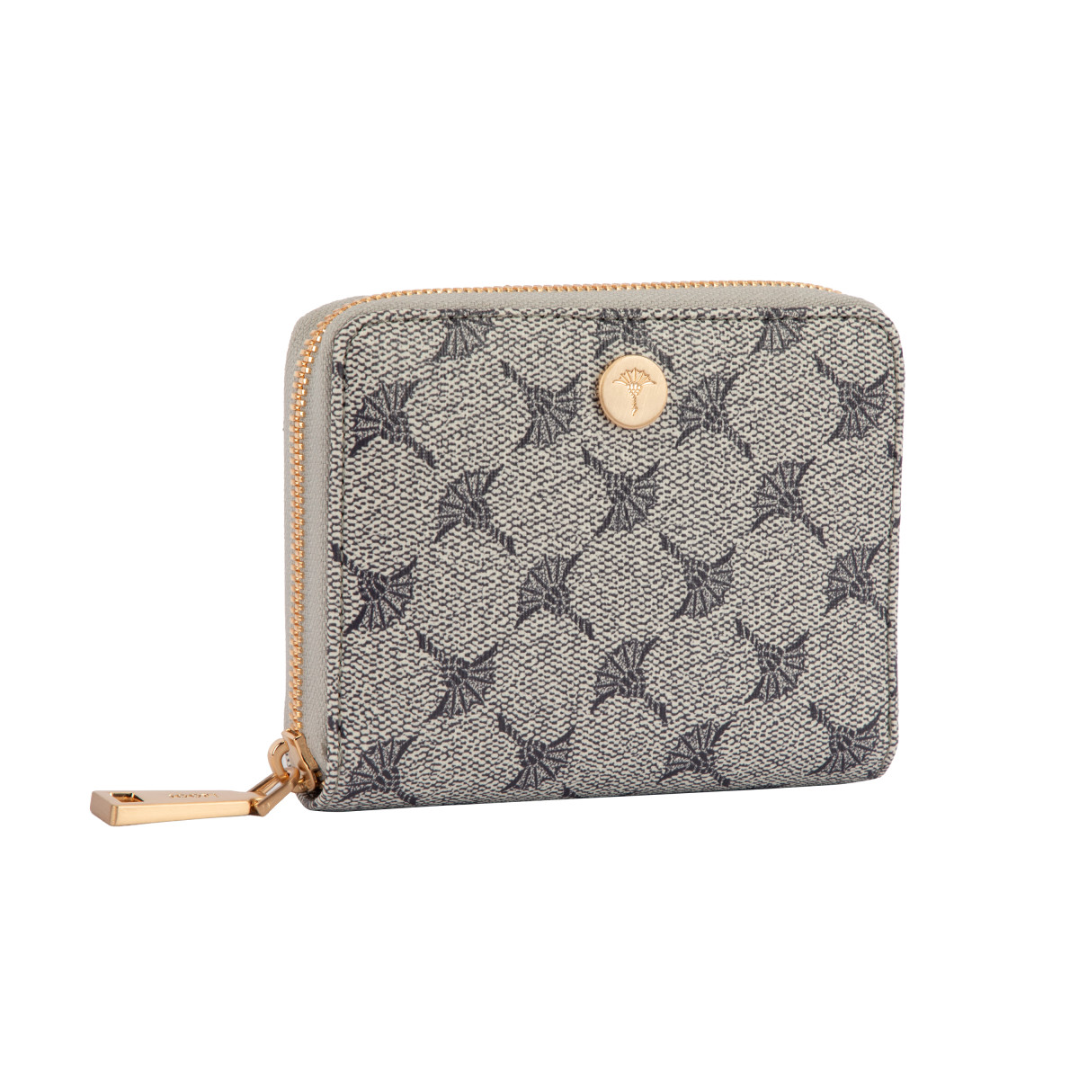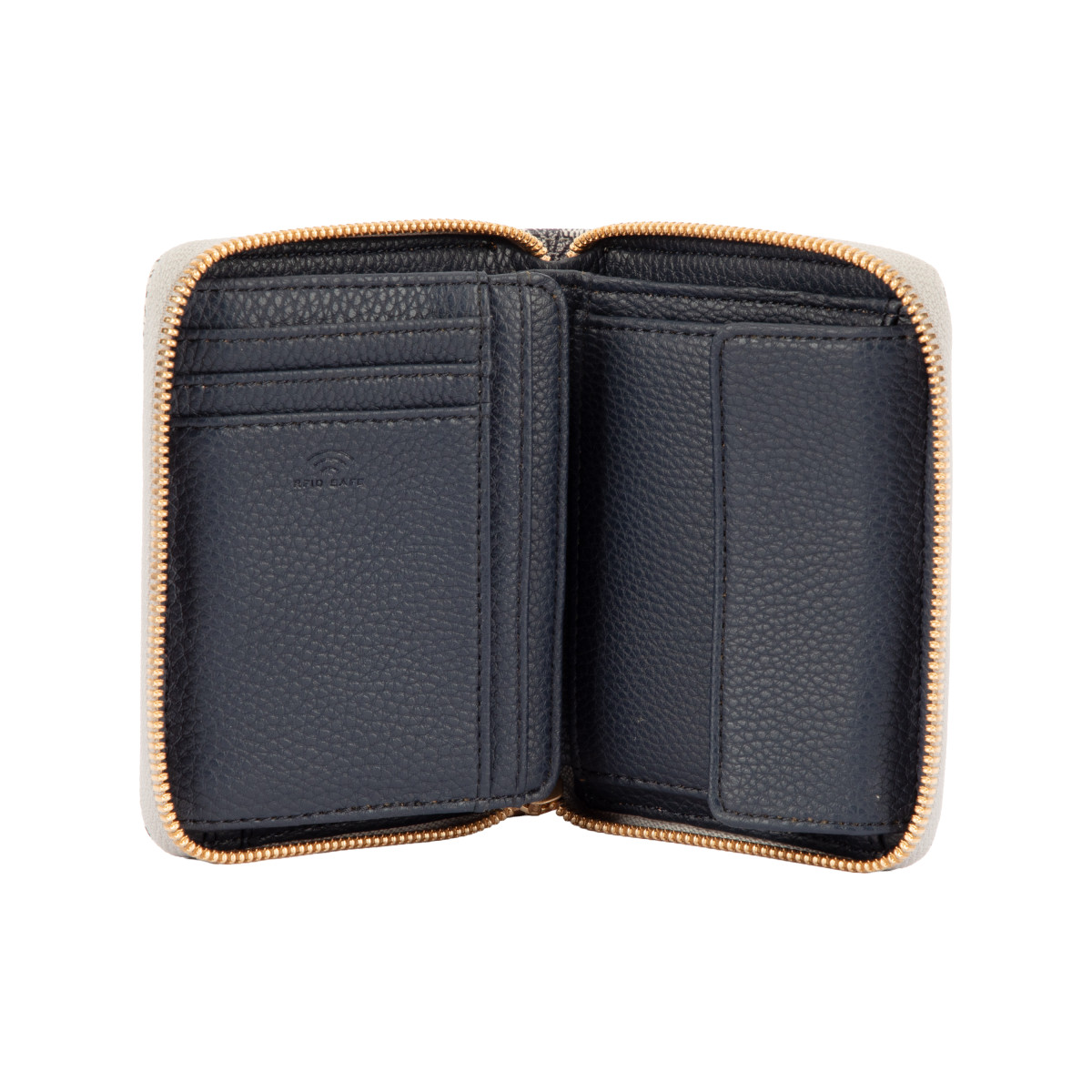 Geldbörse aus genarbtem Kunstleder | Cornflower-Allover | Zip-Verschluss | Label-Plakette auf der Front | Rückseitiges Steckfach | Inlay mit diversen Geldschein-, Karten-, und Steckfächern | Ein extra Münzfach mit Umschlag und Druckknopf | RFID Safe-System