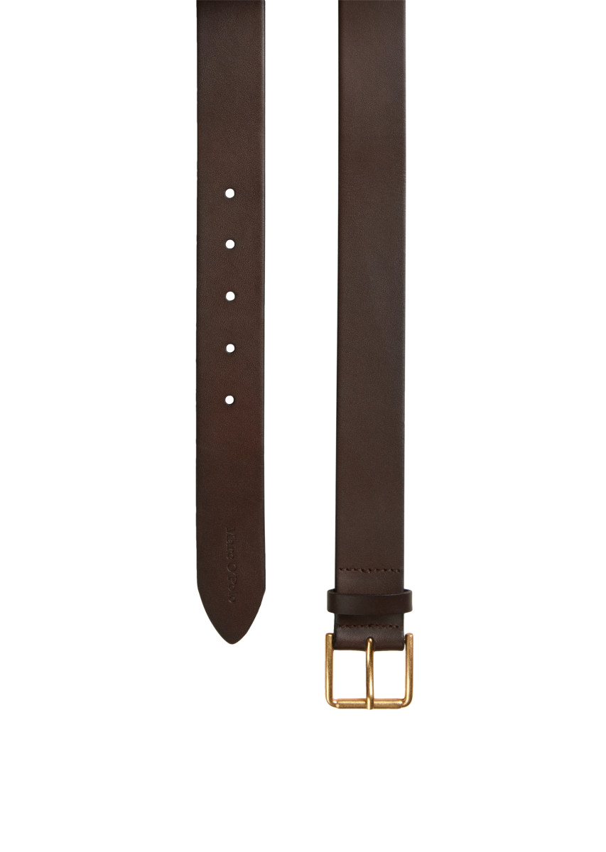 Stilvoller und vielseitig: der hochwertige Gürtel aus softem Rindleder. Die rechteckige, goldfarbene Metallschließe mit sanft abgerundeten Kanten setzt elegante Akzente. Ein abgerundetes Ende mit dezenter Logo-Prägung und die glatte Innenseite betonen die hochwertige Verarbeitung. Ein vielseitiges Accessoire – ideal für Hosen und Röcke.
