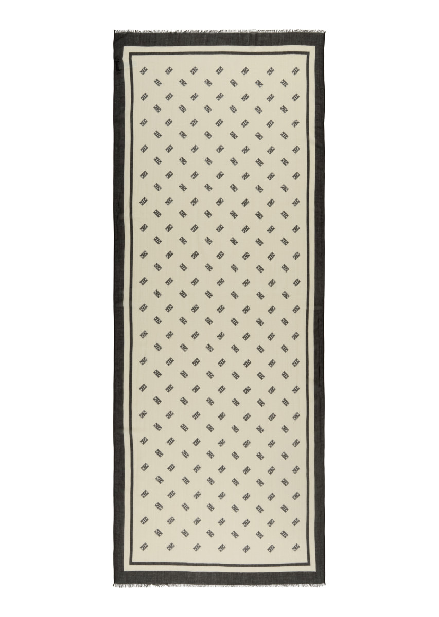 Dieser feine Schal ist ein vielseitiges Accessoire, das jedem Outfit eine elegante Note verleiht. Das leichte, fließende Material ist in einem hellen Cremeton gehalten und mit einem durchgehenden, geometrischen Muster verziert. Der dunkle, breite Rand sorgt für einen schönen Kontrast. Die feinen Fransen am Saum unterstreichen die zarte, luxuriöse Haptik. Ob lässig um den Hals geschlungen oder elegant über die Schultern gelegt – dieser Schal ist der perfekte Begleiter für kühlere Tage und verleiht jedem Look einen Hauch von Raffinesse.