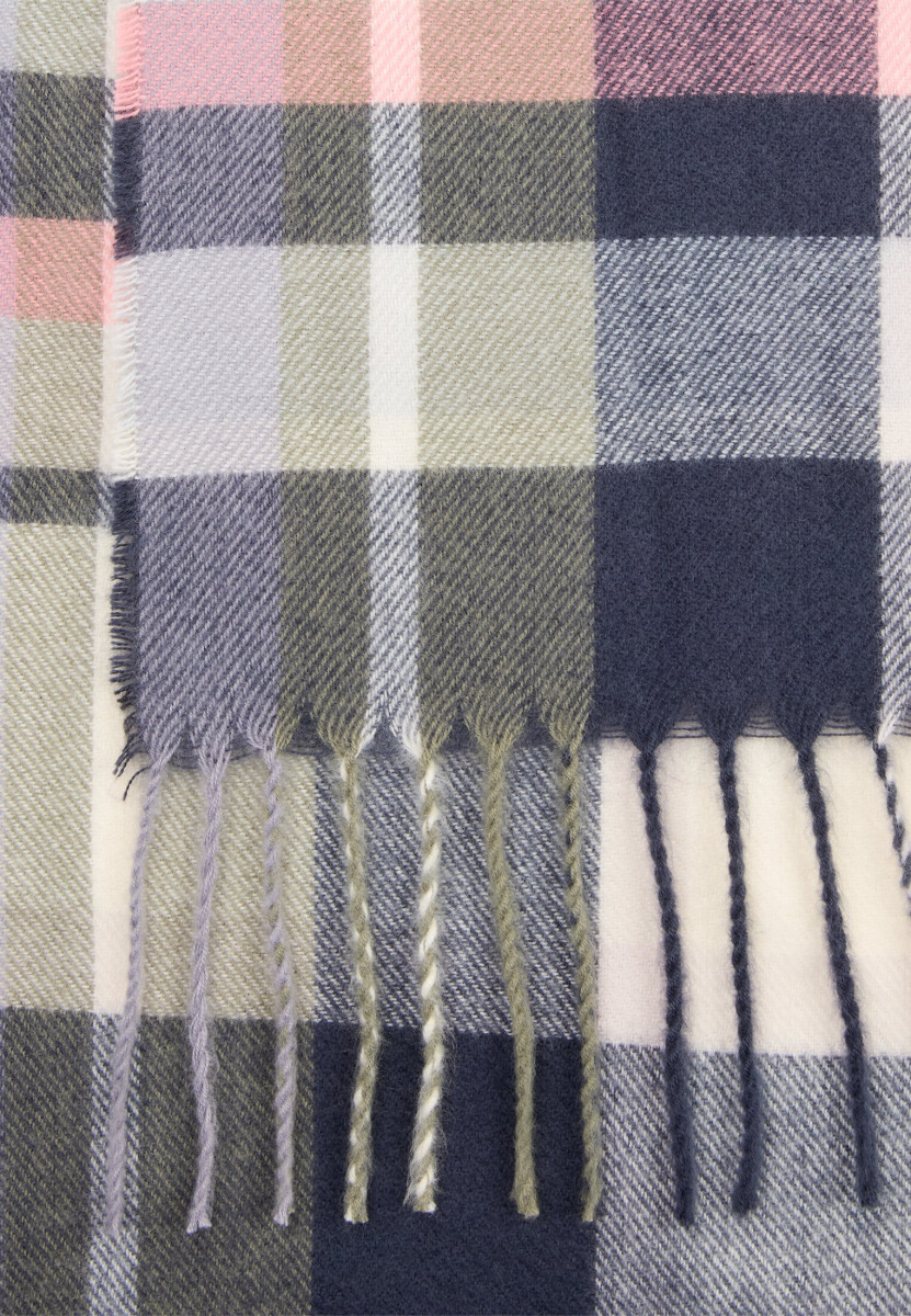 Dieser karierte Schal ist das ideale Accessoire, um Ihrem Outfit eine stilvolle und warme Note zu verleihen. Die moderne, großflächige Farb-Block-Optik kombiniert harmonisch zartes Rosé mit klassischem Olivgrün und warmem Grau.
