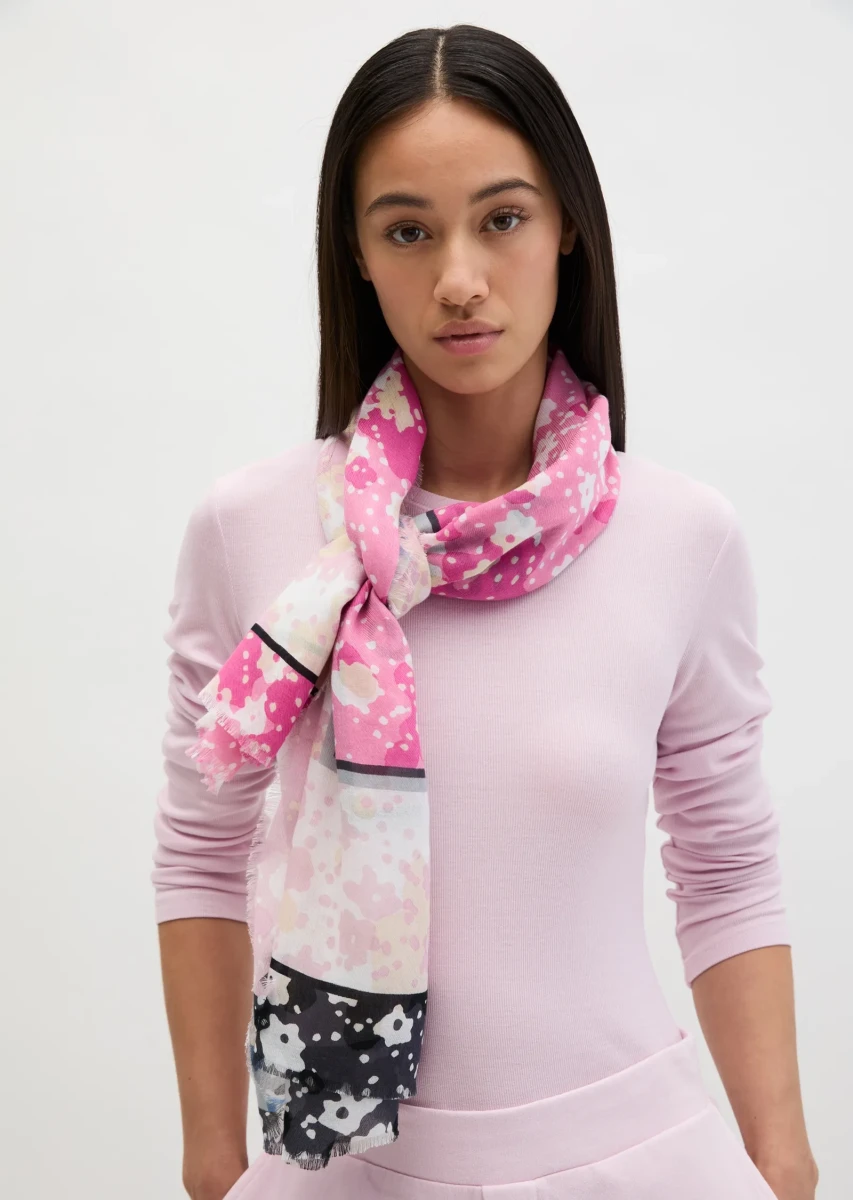 Dieser fein gewebte, stylische Schal aus einem hochwertigen Bio-Baumwoll-Modal-Mix ist leicht, weich und unkompliziert zu stylen. Das Modell mit Allover-Print und gefransten Kanten ist in verschiedenen modernen Farbstellungen erhältlich. Der Schal lässt sich vielseitig binden und drapieren. Ob locker um den Hals gebunden, als Schultertuch zum Cocktailkleid, als Gürtel zur Jeans, als Haaraccessoire oder einfach um den Henkel der Lieblingstasche gewickelt – die Möglichkeiten sind endlos.
