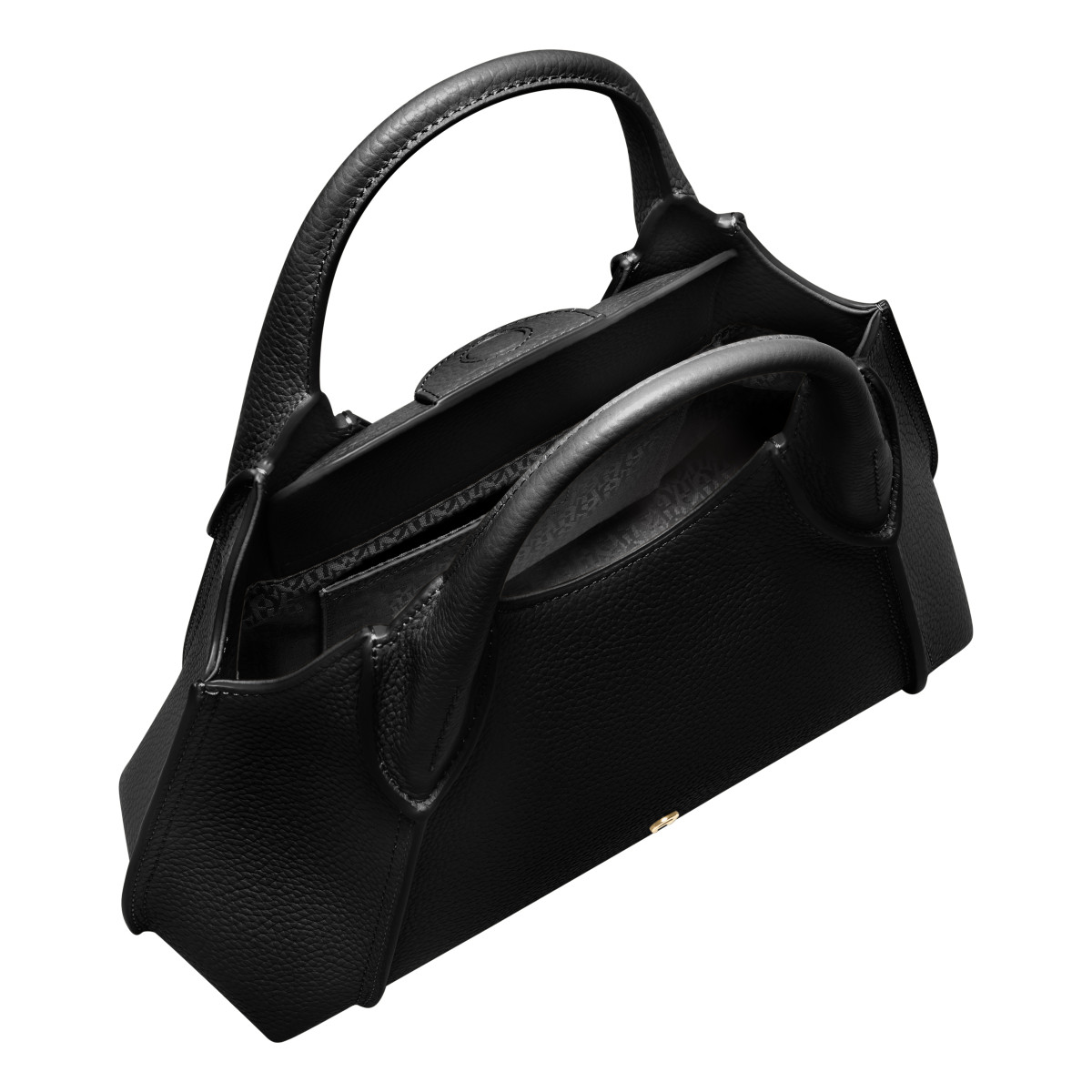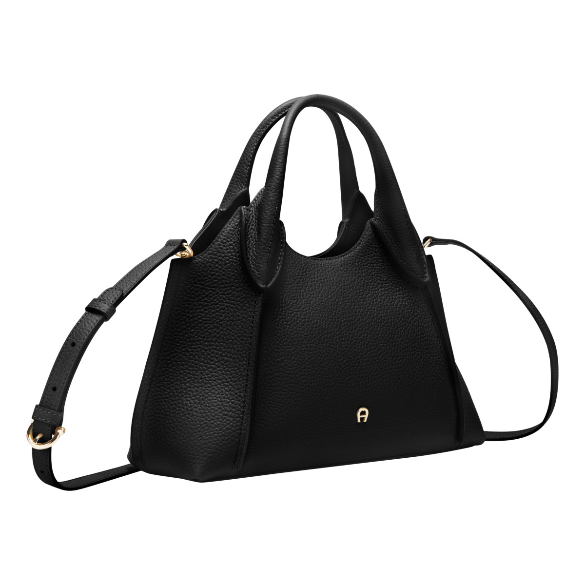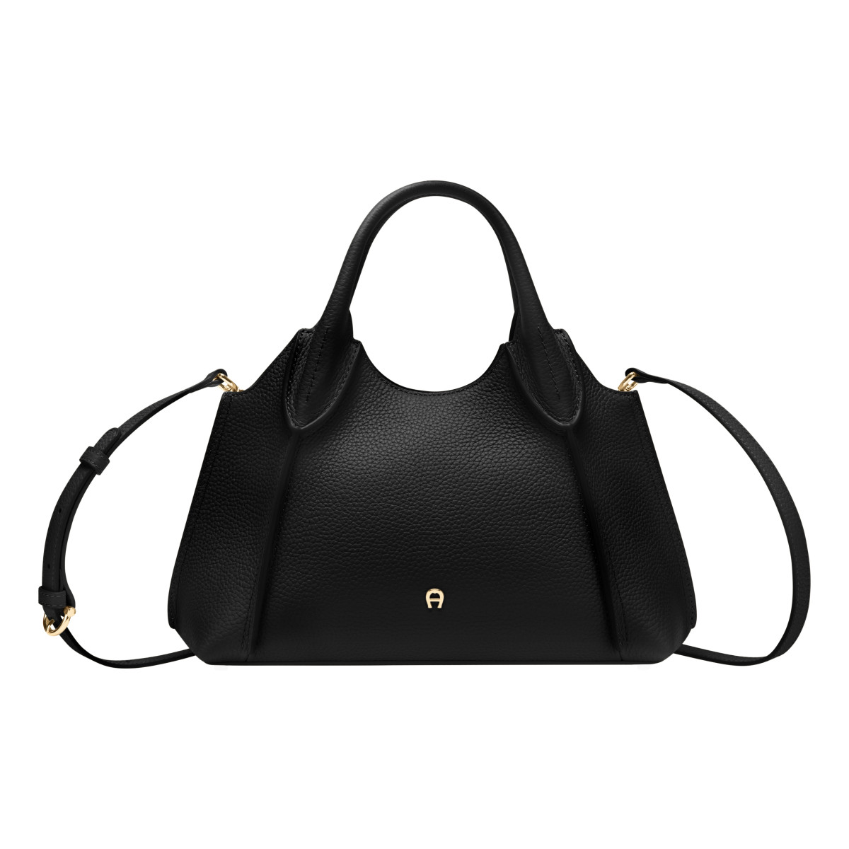 Die AIGNER Kayla Beuteltasche M in Schwarz ist eine elegante Handtasche aus genarbtem Rindsleder. Mit glänzenden, hellgoldfarbenen Metallteilen und einem goldfarbenen Logo-Emblem setzt sie stilvolle Akzente. Der Magnetverschluss ermöglicht einen sicheren Verschluss, während das Innenleben mit einem Steckfach für Ordnung sorgt. Vier schützende Bodenfüße schützen die Tasche vor Abnutzung.