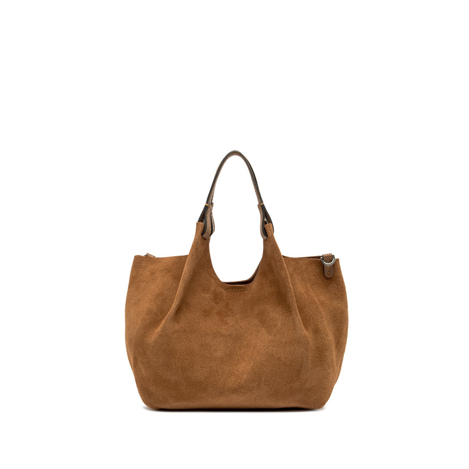 Ein dezentes Markenlogo auf einer aufgesetzten Lederplakette unterstreicht die Qualität und Herkunft dieser Tasche. Ob im Büro oder in der Freizeit, diese Velours-Tasche ist ein luxuriöses Accessoire, das mühelos Stil und Funktionalität vereint und jedem Outfit eine warme, edle Note verleiht. Ein Must-have für Liebhaberinnen hochwertiger Lederwaren.