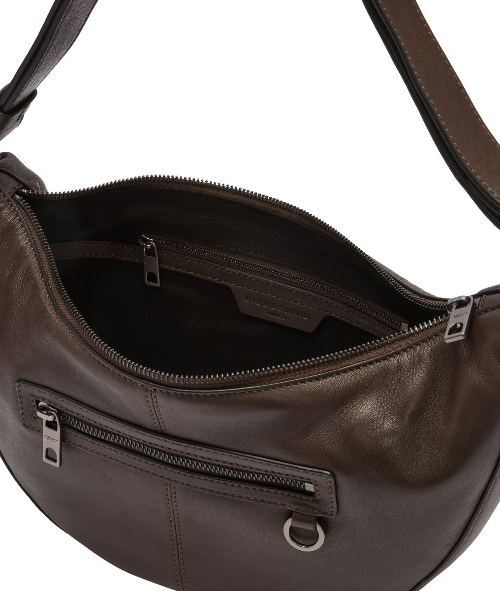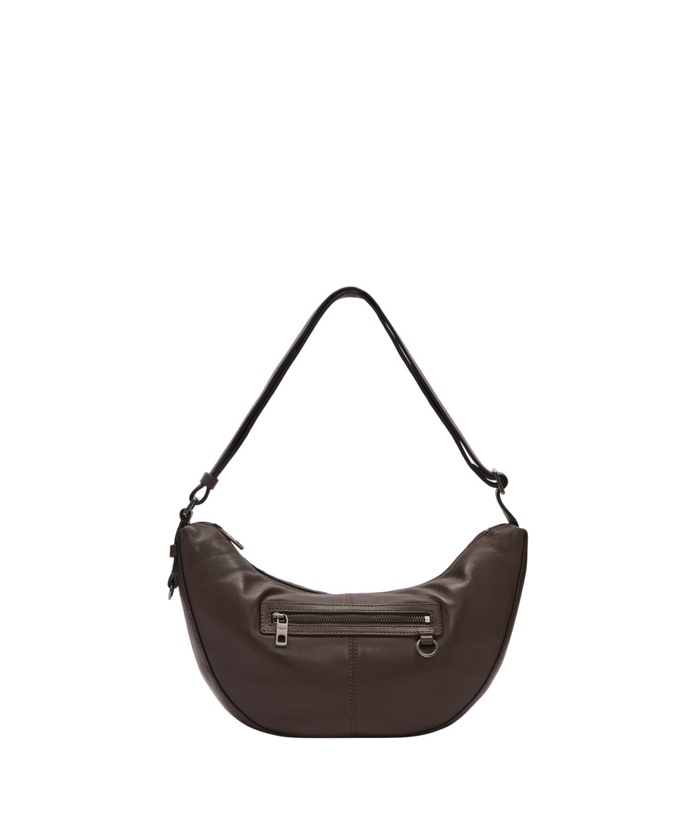 Moon Hobo S interpretiert minimalistisches Design neu – mit natürlich genarbtem Schafsleder, markanten Details und kompakter Silhouette. Die neue Größe macht sie zur idealen Umhängetasche für den Alltag, während der verstellbare Schulterriemen flexibles Tragen ermöglicht. Eine auffällige Fronttasche mit Reißverschluss bringt Struktur in die weichen Linien und schafft zusätzlichen Stauraum. Innen sorgen ein Reißverschlussfach und ein Steckfach für Ordnung. Zwei Keyrings – seitlich und auf der Front – bieten Platz für persönliche Akzente.