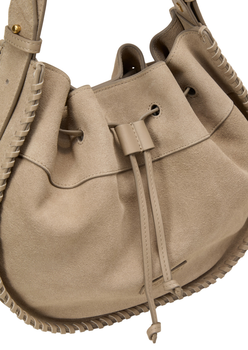 Ein ausdrucksstarkes Design, das Materialität und Detailfreude in den Fokus stellt. Diese mittelgroße Schultertasche aus softem Velours-Rindleder wirkt durch geflochten eingefasste Kanten besonders hochwertig. Der breite, mit Noppen verstellbare Schulterriemen ermöglicht flexible Trageoptionen, während eine Lederkordel die Weite individuell reguliert. Im Inneren bietet das mit Organic Cotton gefütterte Hauptfach Platz für Essentials, sicher geschlossen per Magnetknopf. Ein seitliches Zipperfach ergänzt die durchdachte Innenaufteilung.