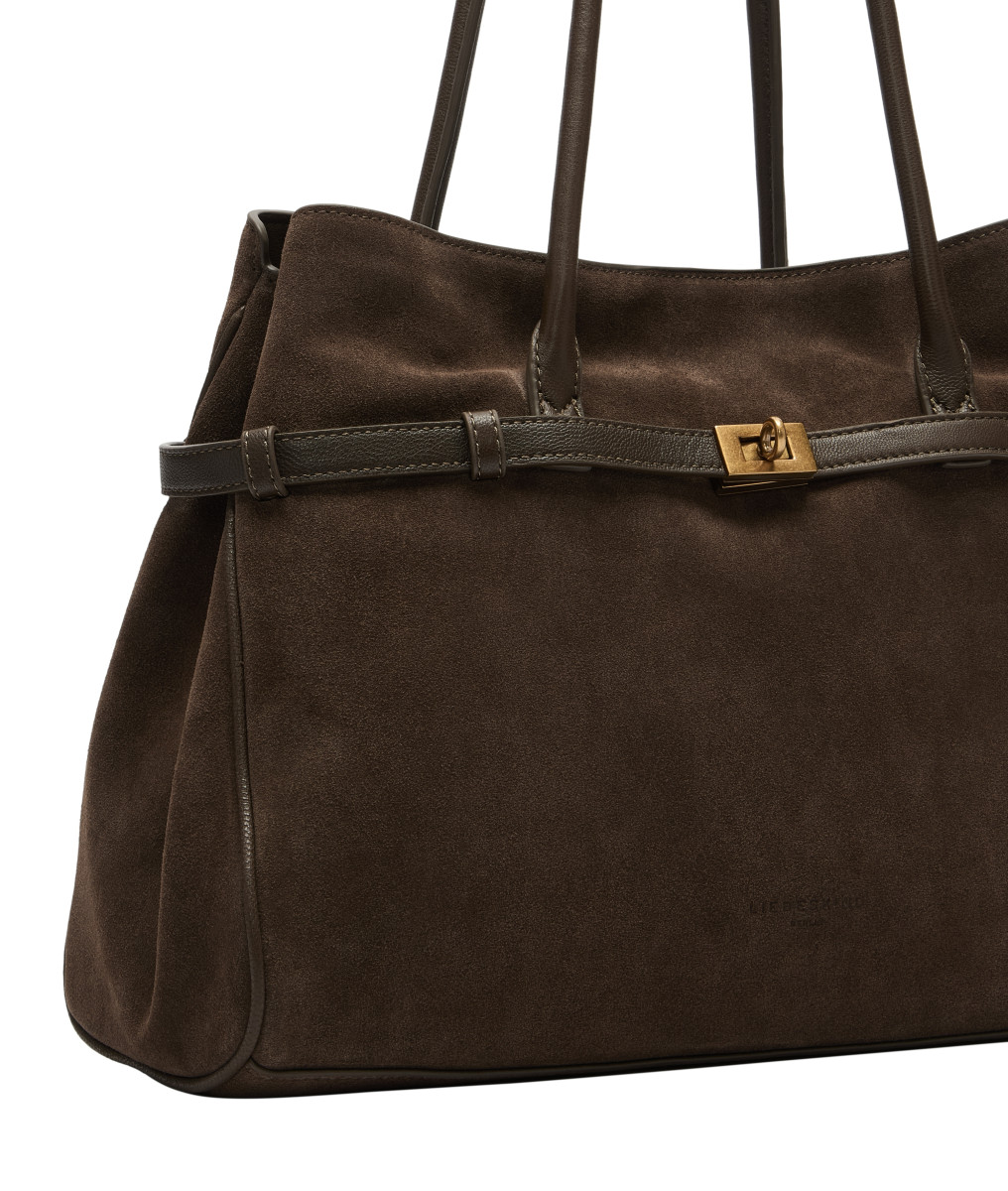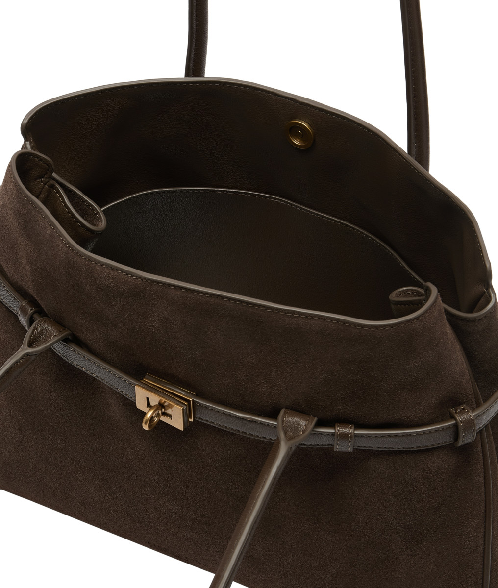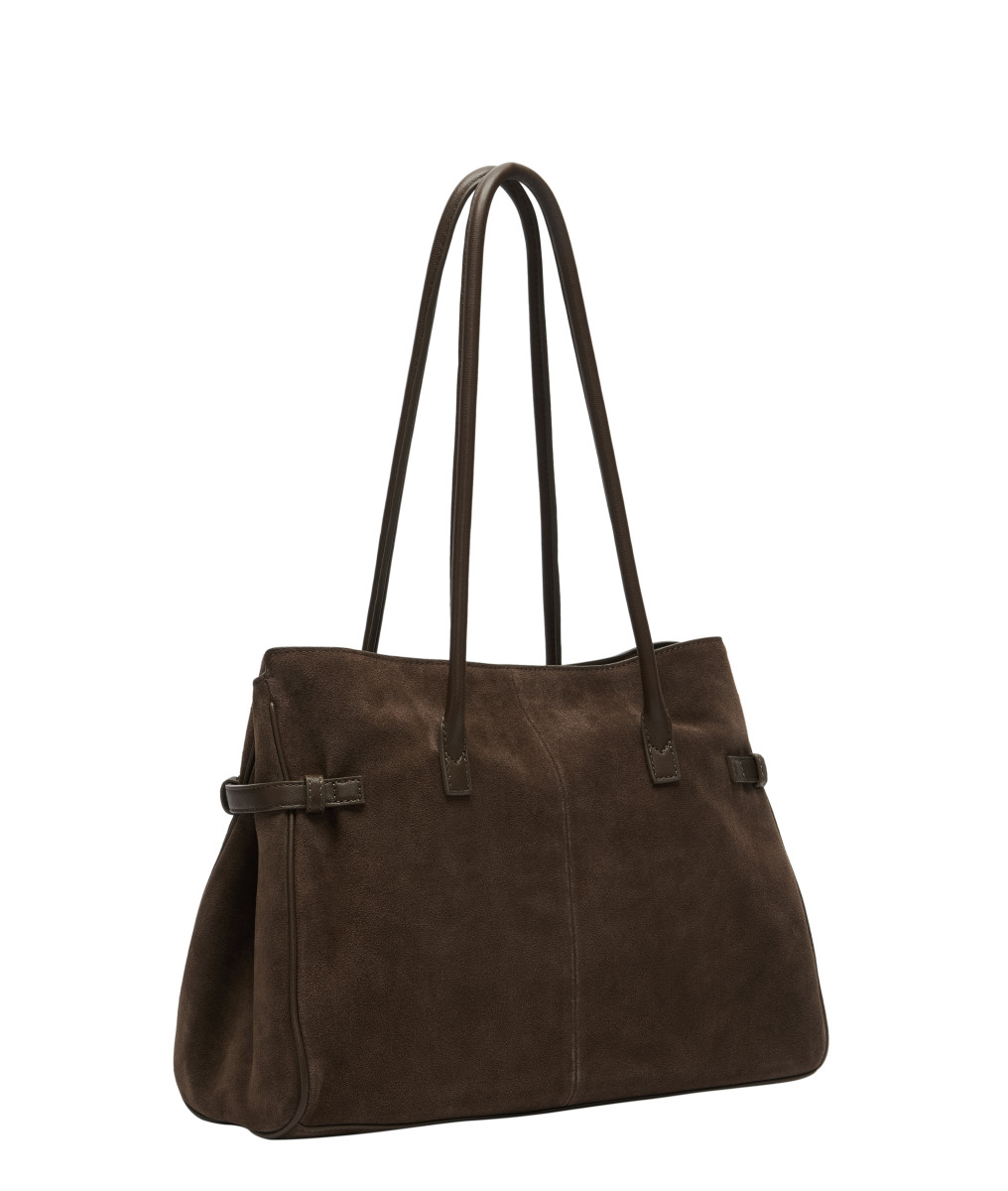 Nori Satchel L bringt Größe und Struktur auf den Punkt. Gefertigt aus weichem Veloursleder, kombiniert sie ein geradliniges Design mit durchdachter Funktion. Die dekorative Schließe auf der Front verleiht der Tasche einen charakteristischen Akzent, während seitliche Druckknöpfe ihre Breite variabel halten – je nach Anlass oder Inhalt. Im Inneren sorgen ein großes Steckfach und ein Reißverschlussfach für Übersicht. Zwei stabile Tragehenkel garantieren Komfort, ganz gleich, wie der Tag verläuft.