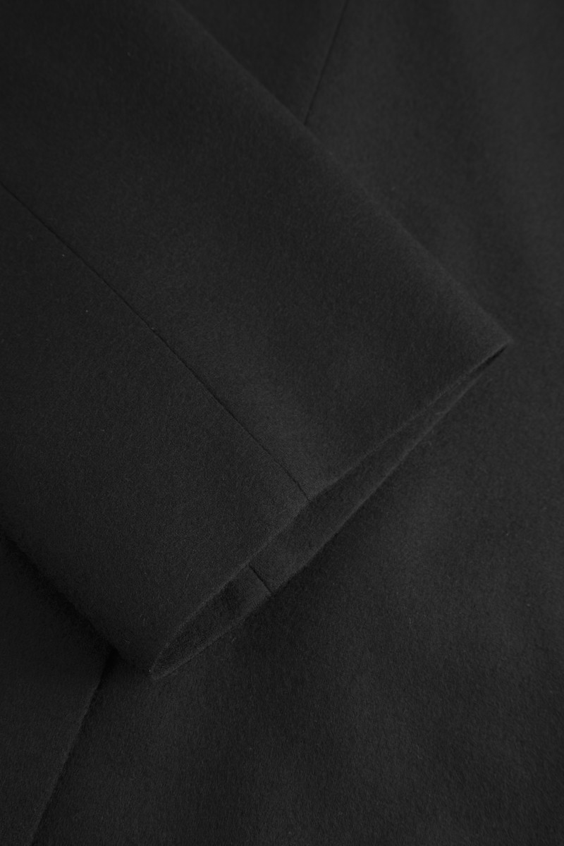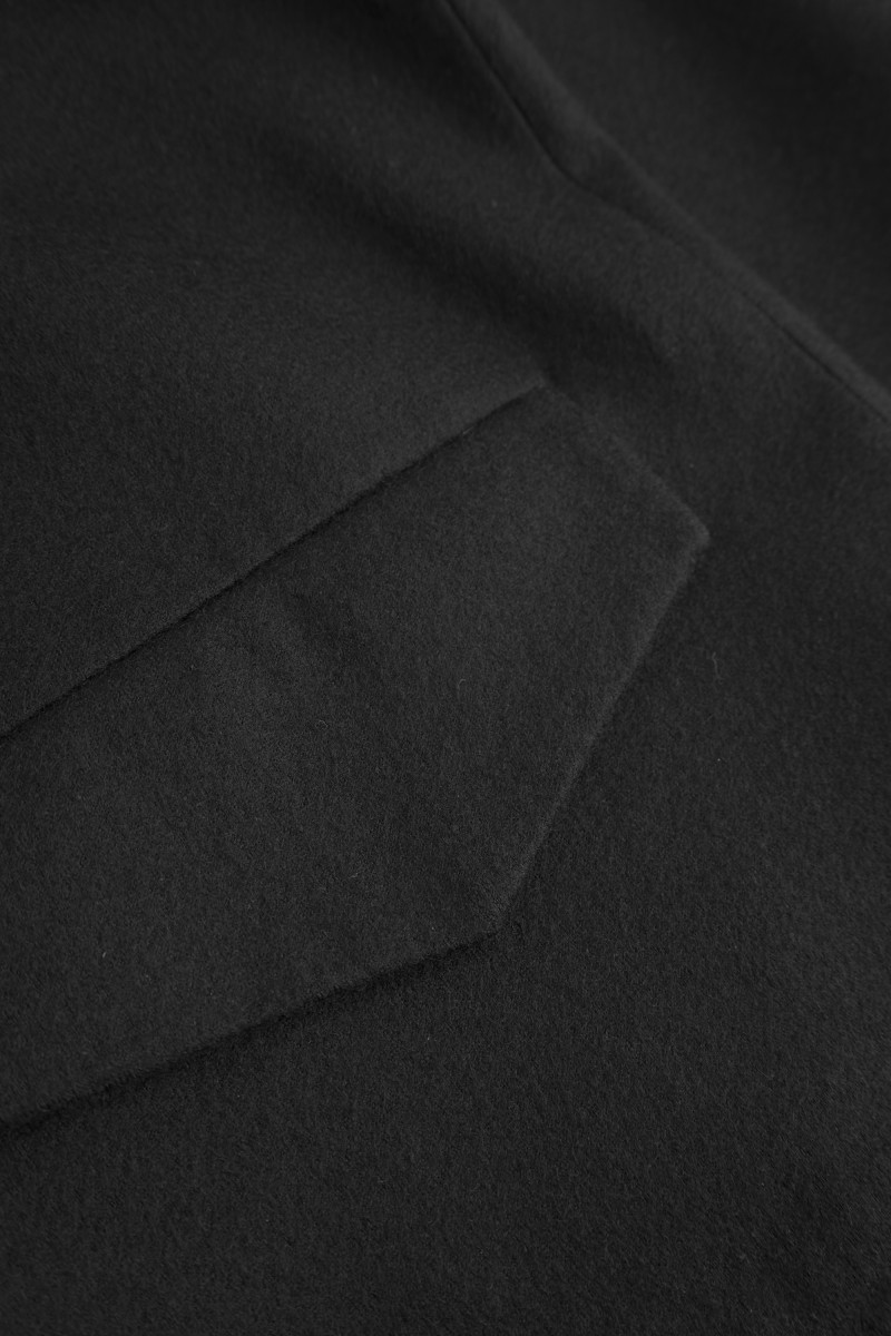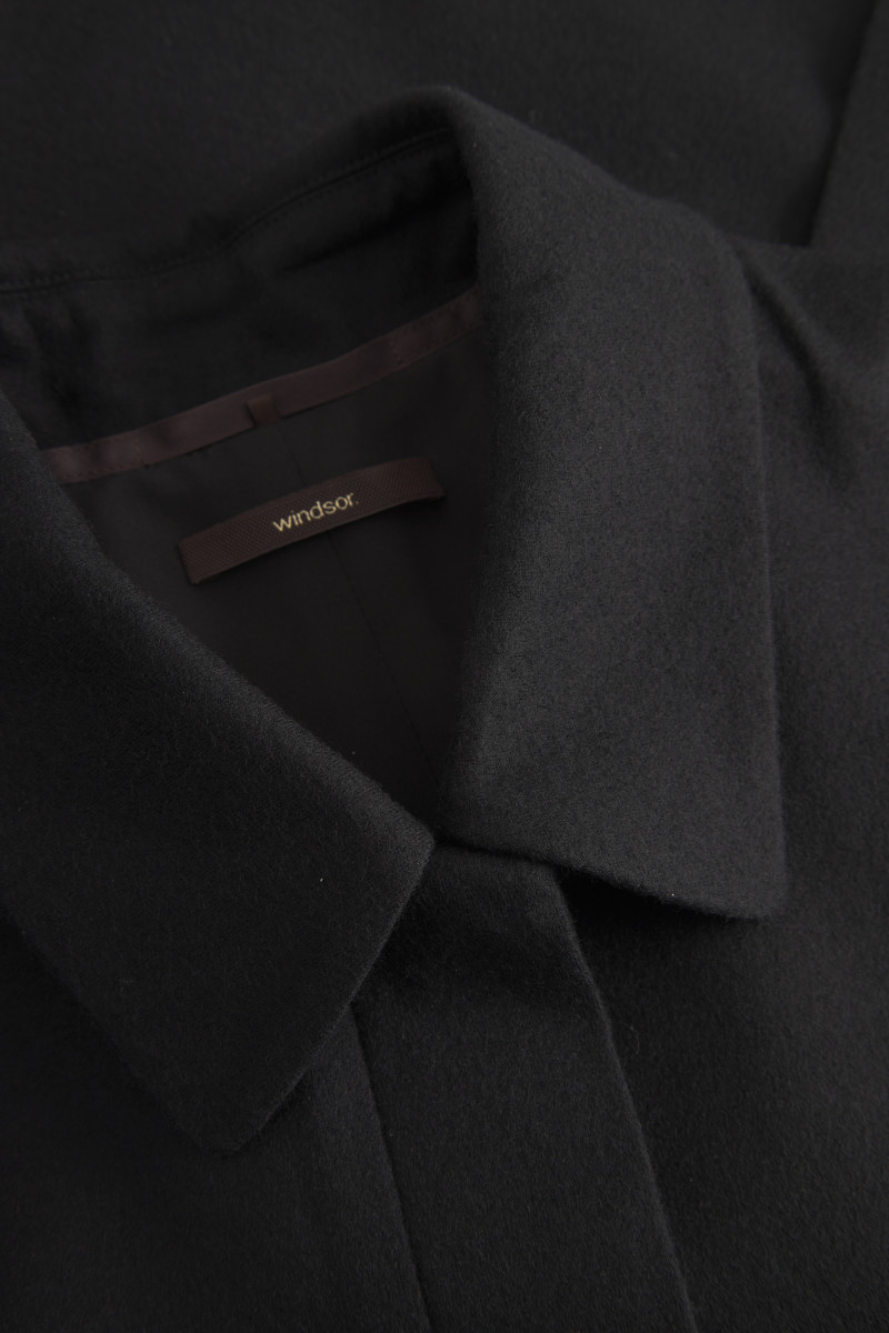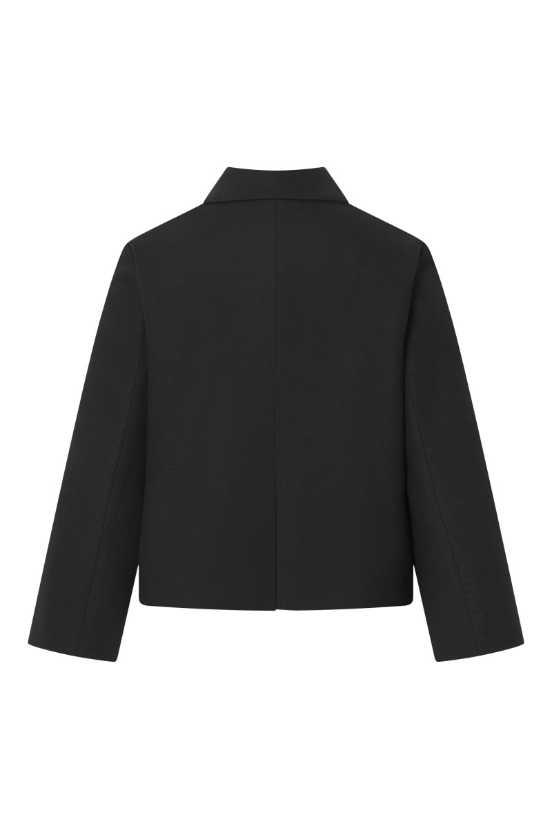 Diese kurze Damenjacke in klassischem Schwarz vereint stilvolle Eleganz mit minimalistischer Modernität. Mit ihrer klaren Linienführung, dem klassischen Umlegekragen und den dezent verdeckten Verschlüssen ist sie das perfekte Statement-Piece für stilbewusste Frauen, die Wert auf Qualität und Design legen.
