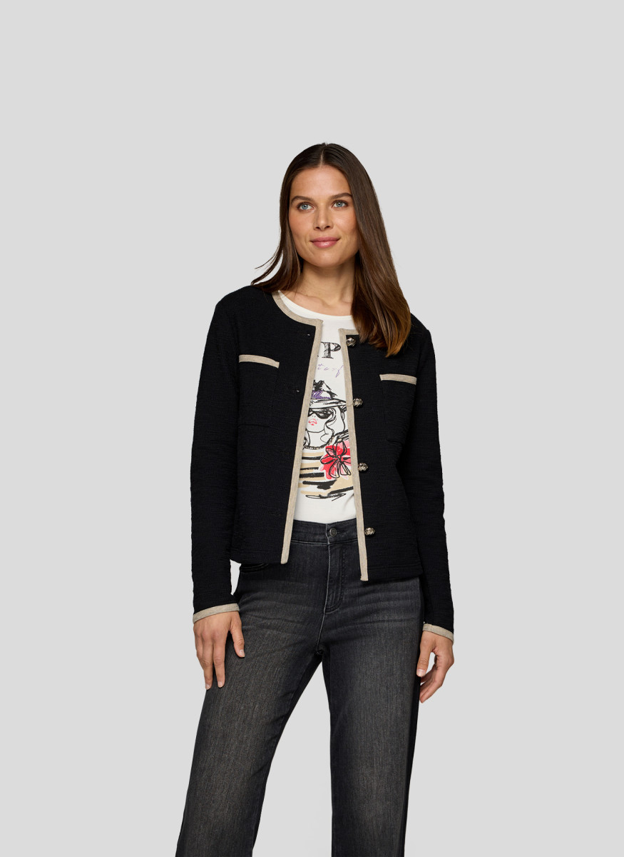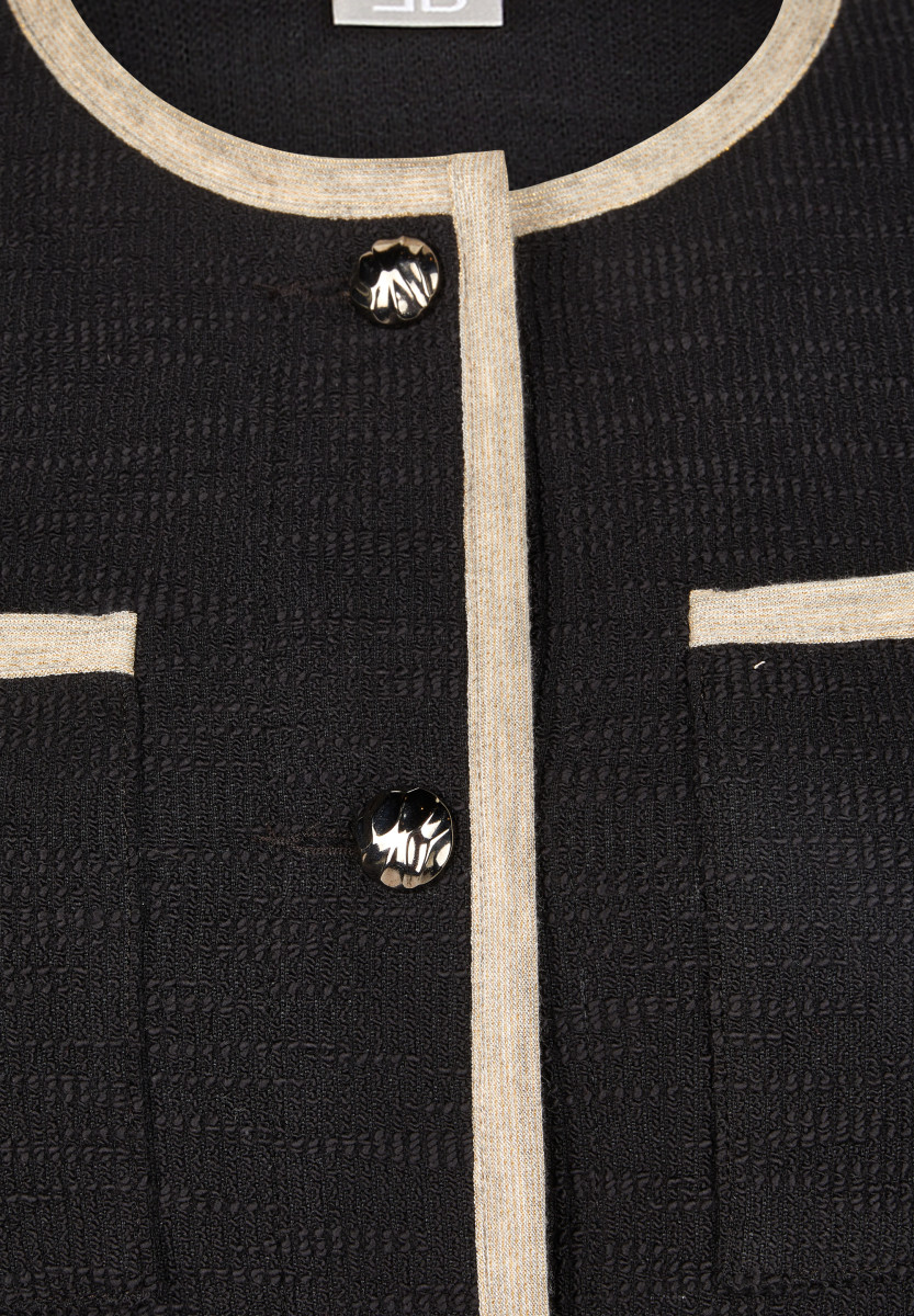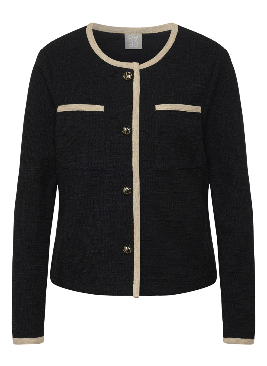 Diese elegante Strickjacke überzeugt mit edlen Kontrastdetails entlang der Kanten, Taschen und Ärmelabschlüsse. Die dekorativen Knöpfe verleihen der Jacke eine klassische Note, während die gerade Form für eine schmeichelnde Silhouette sorgt. Perfekt kombinierbar zu Hosen oder Röcken für einen gepflegten Look. Rundhalsausschnitt. Kontrastfarbene Blenden. Dekorative Knöpfe. Zwei aufgesetzte Taschen. Angenehme Strickqualität.