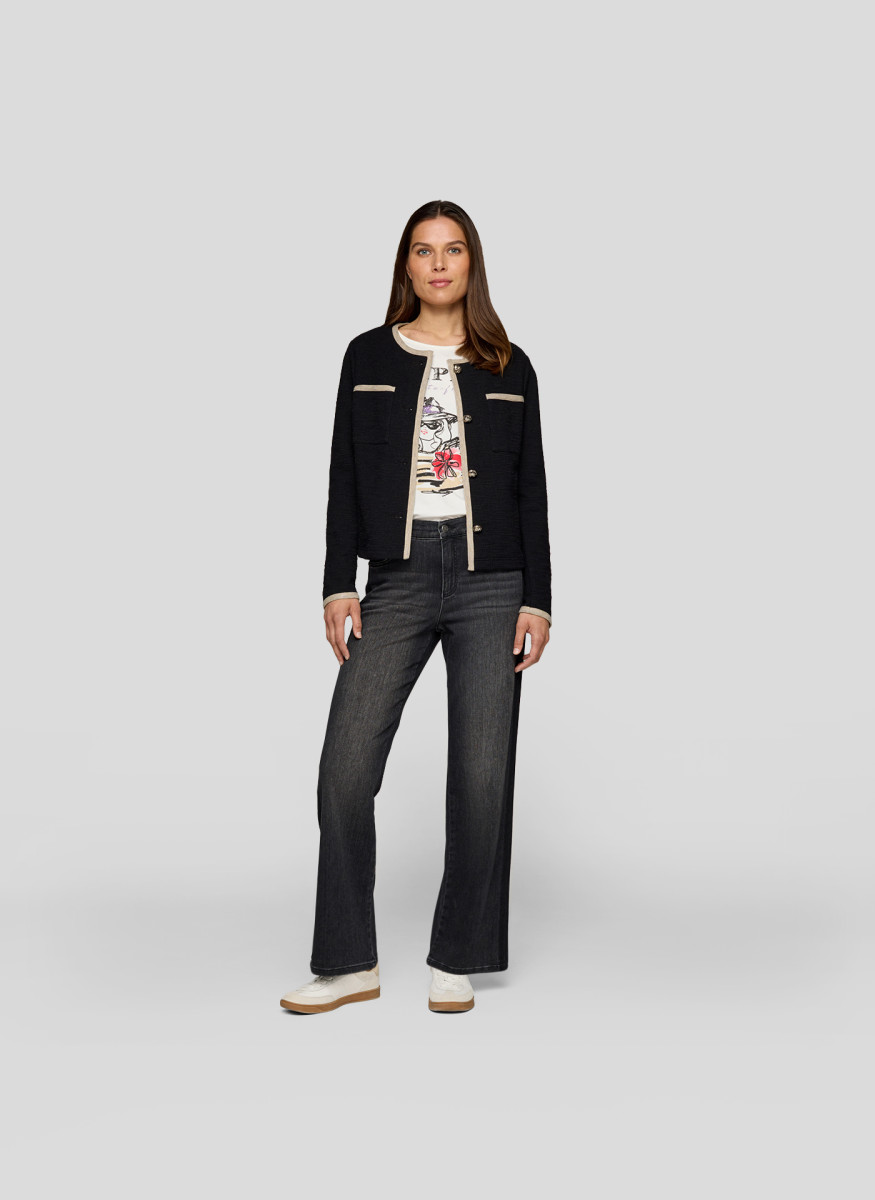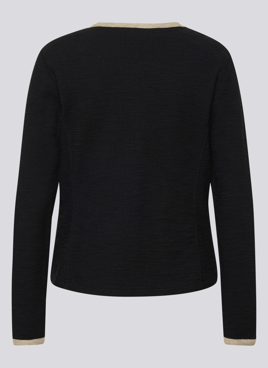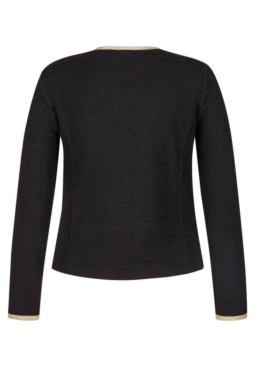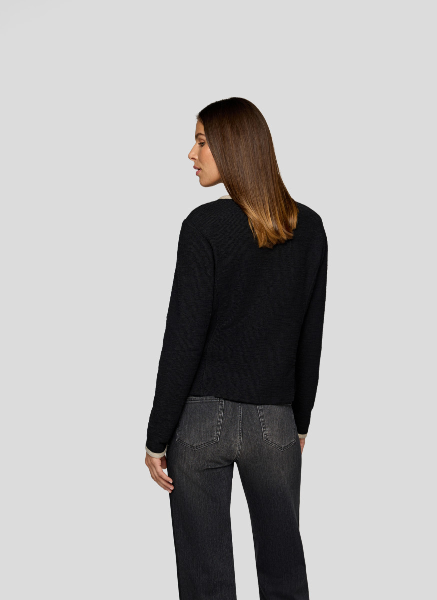 Diese elegante Strickjacke überzeugt mit edlen Kontrastdetails entlang der Kanten, Taschen und Ärmelabschlüsse. Die dekorativen Knöpfe verleihen der Jacke eine klassische Note, während die gerade Form für eine schmeichelnde Silhouette sorgt. Perfekt kombinierbar zu Hosen oder Röcken für einen gepflegten Look. Rundhalsausschnitt. Kontrastfarbene Blenden. Dekorative Knöpfe. Zwei aufgesetzte Taschen. Angenehme Strickqualität.