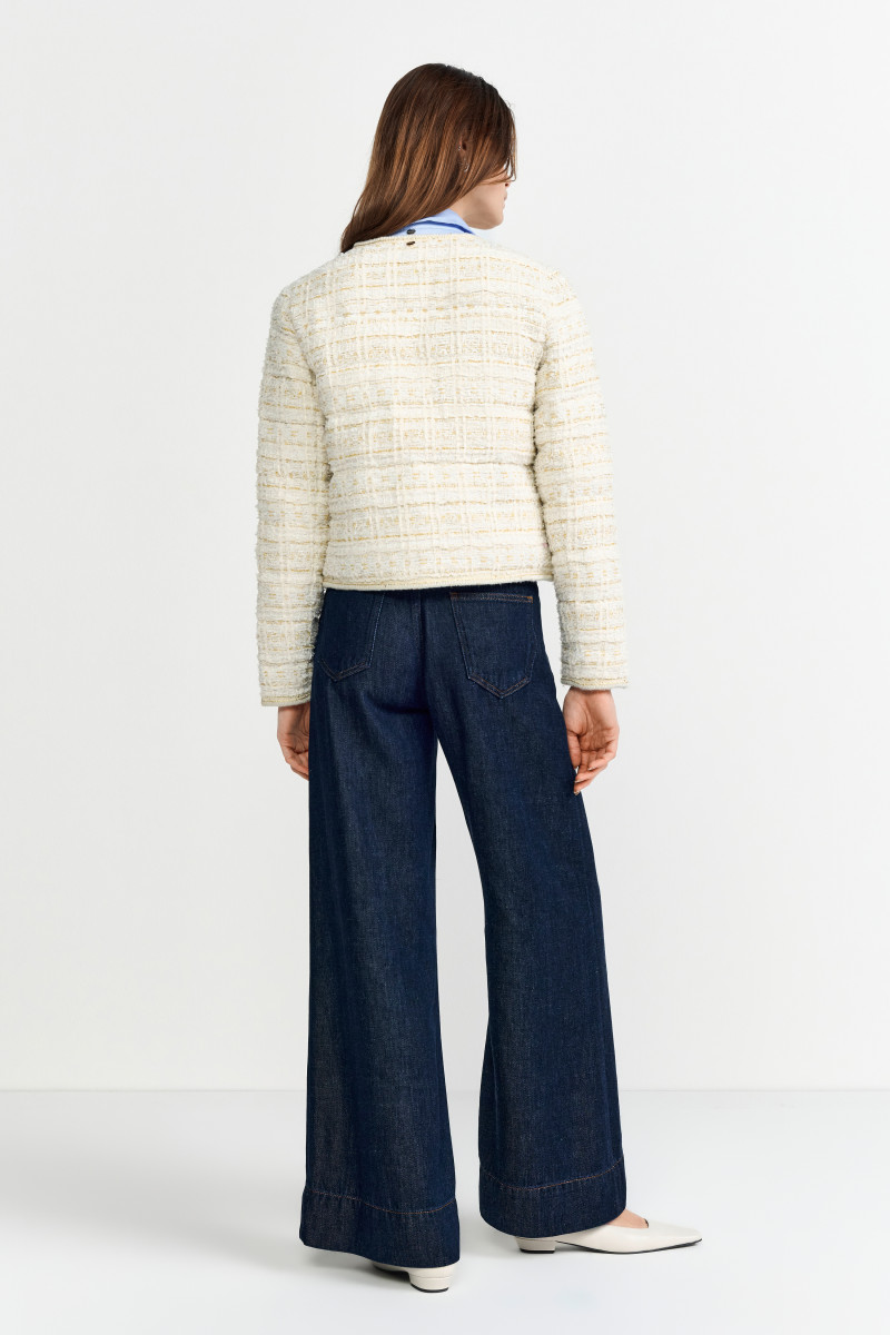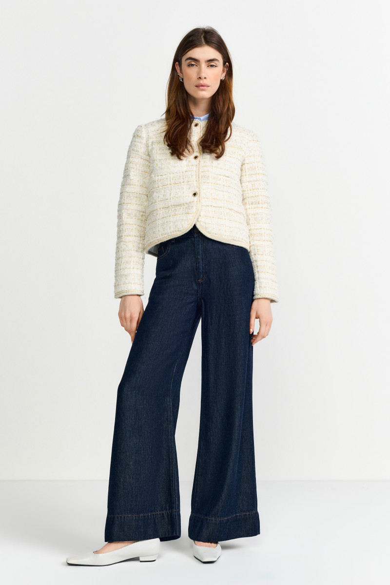 Verleihen Sie Ihrem Look einen Hauch von Luxus mit dieser stilvollen Bouclé-Jacke in edlem Cremeweiß mit schimmernden Goldfäden. Das exklusive Design von Rich & Royal kombiniert klassische Eleganz mit modernen Akzenten – perfekt für stilbewusste Frauen, die Wert auf hochwertige Materialien und zeitlose Mode legen.