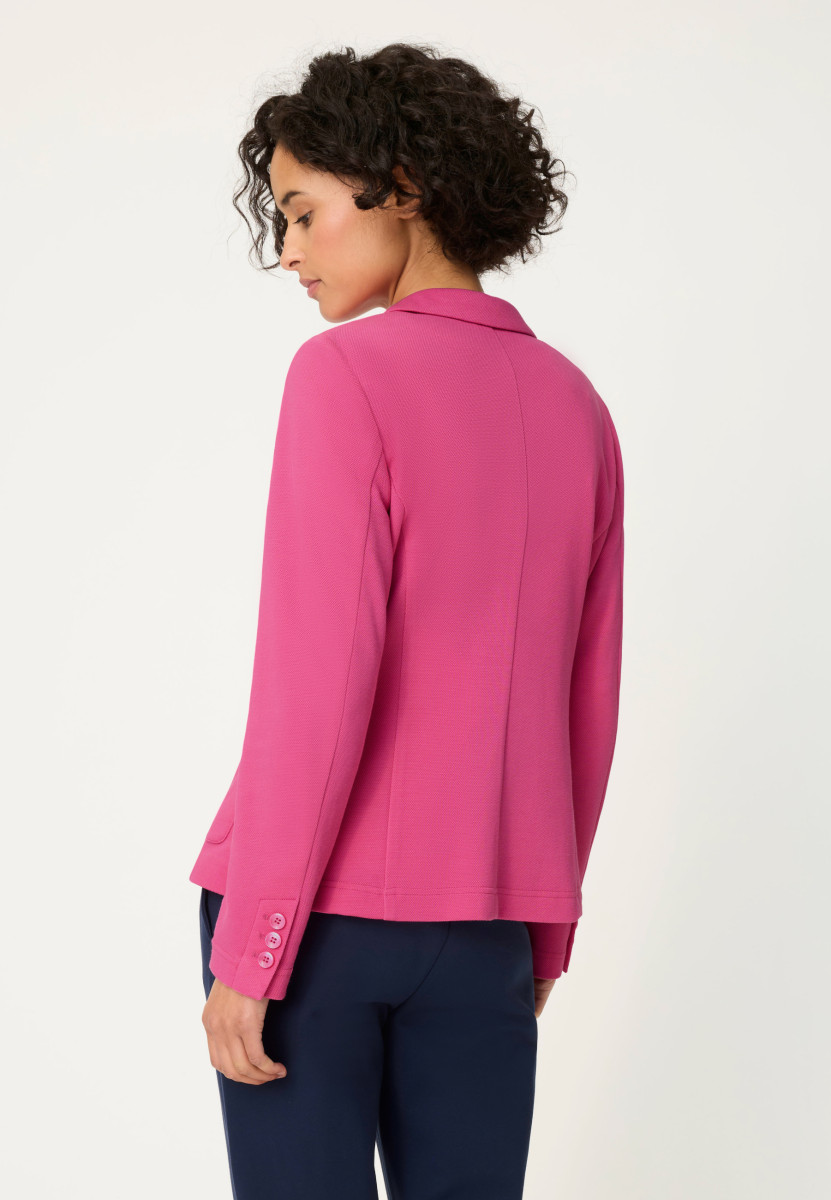 Dieser stylishe Jersey-Blazer ist ein absoluter Traum! Gekonnt vereint er Stil und Komfort, weshalb er sich zu unterschiedlichen Outfits perfekt kombinieren lässt. An den Ärmelabschlüssen befinden sich jeweils drei kleine Knöpfe, zwei größere Verschlussknöpfe auf Bauchhöhe. Die beiden aufgesetzten Taschen auf der Vorderseite sorgen für eine sportive Note. Gefertigt aus einem Wohlfühlmix aus Polyester und Baumwolle liegt der Blazer weich auf der Haut auf. Länge ca. 60 cm.