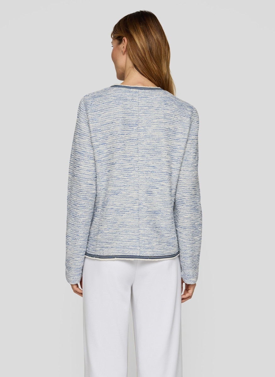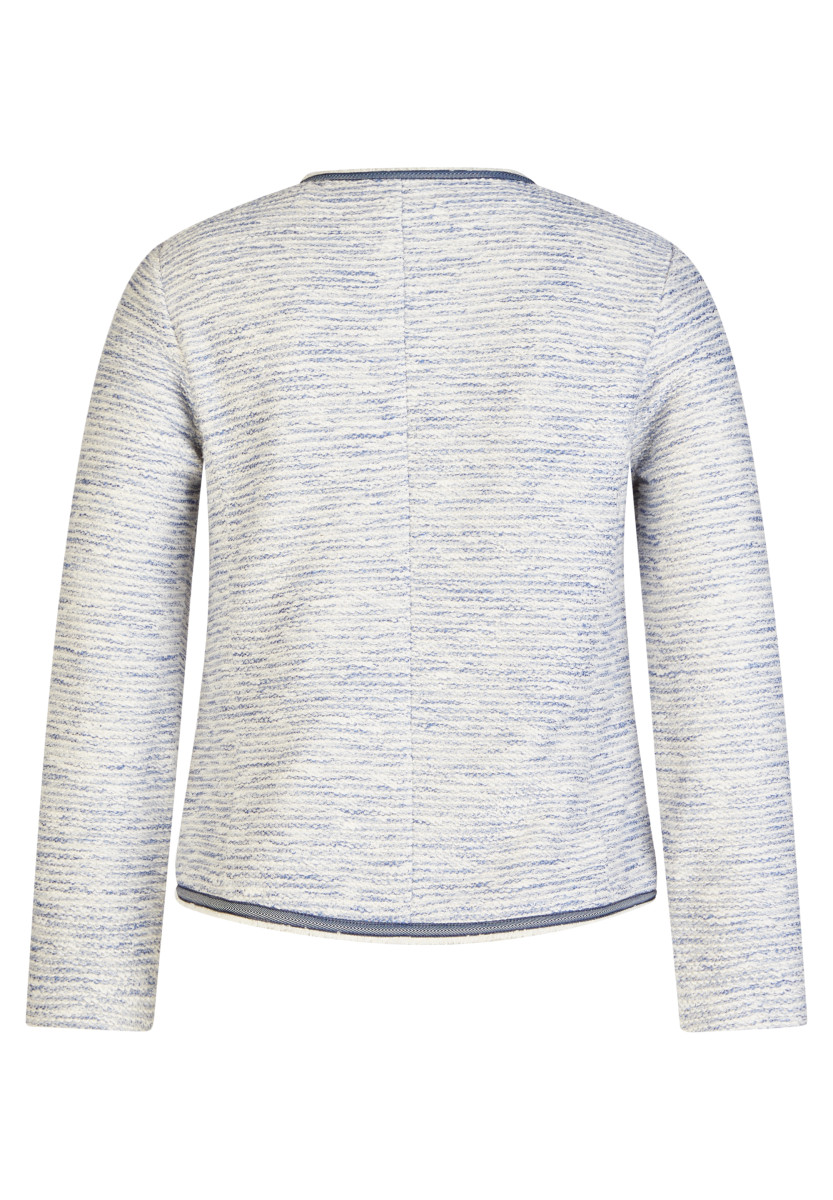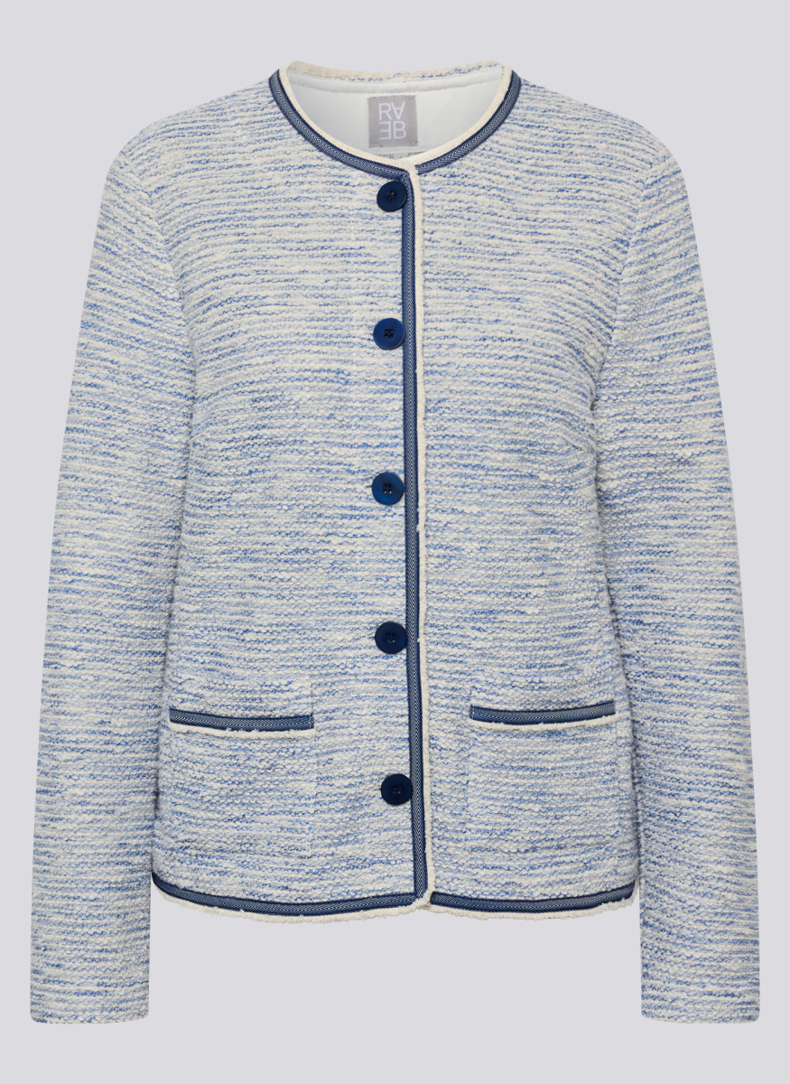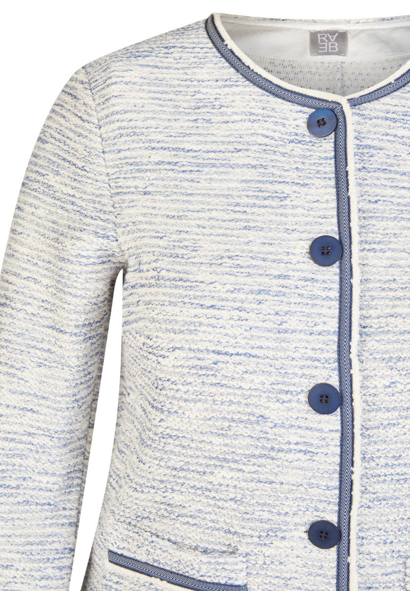 Diese Jacke zeigt sich in einer fein strukturierten Qualität mit angenehm hohem Baumwollanteil und formstabilen Kunstfasern. Der Rundhalsausschnitt, die durchgehende Knopfleiste sowie die kontrastfarbigen Paspeln an Kanten und Taschen verleihen ihr eine gepflegte, moderne Ausstrahlung, während die aufgesetzten Taschen den klassischen Charakter unterstreichen. Das leichte Material sorgt für ein komfortables Tragegefühl und macht den Blazer ideal für Büro und Alltag.Lief.-Art-Nr: 56-118225