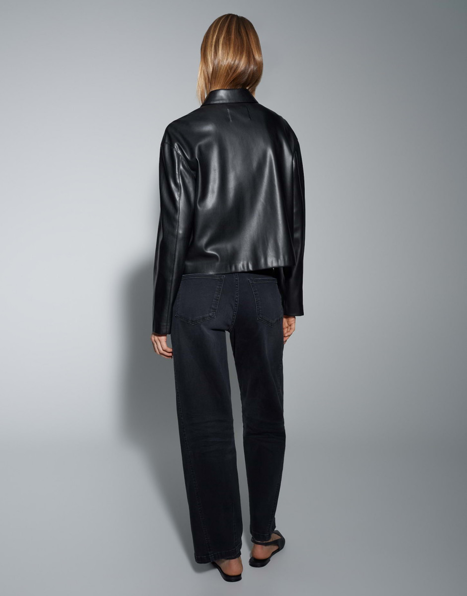 Lockere Passform | Leicht verkürzt geschnitten | Langarm | Umlegekragen | Weicher Griff | Lederimitat | Ungefüttert | Dezente Struktur | Matter Glanz in der Oberfläche