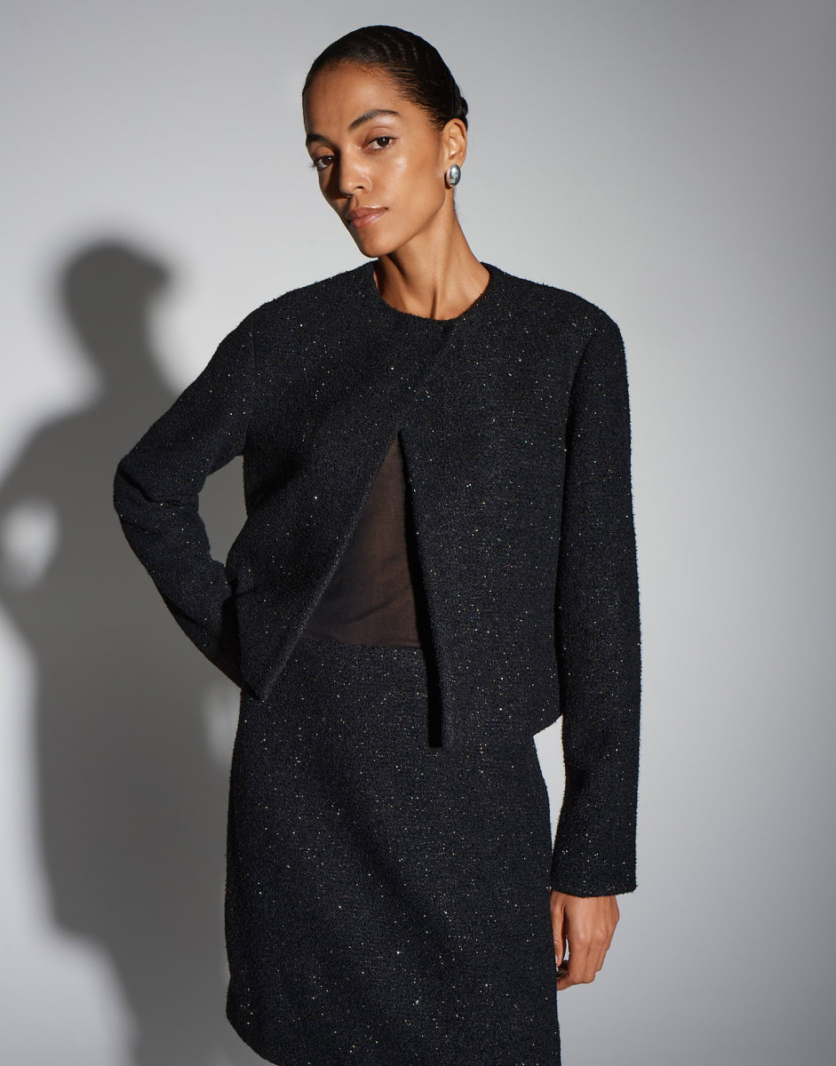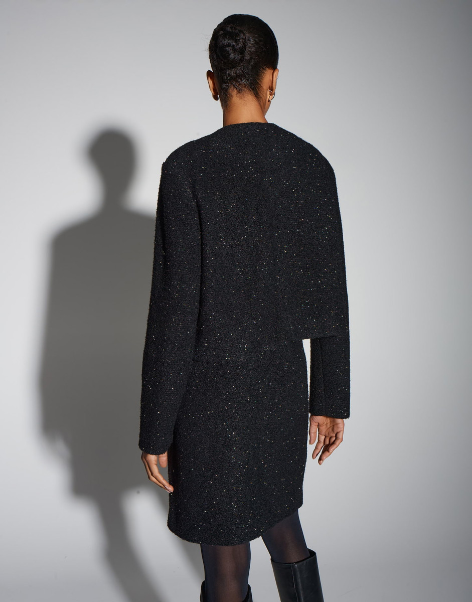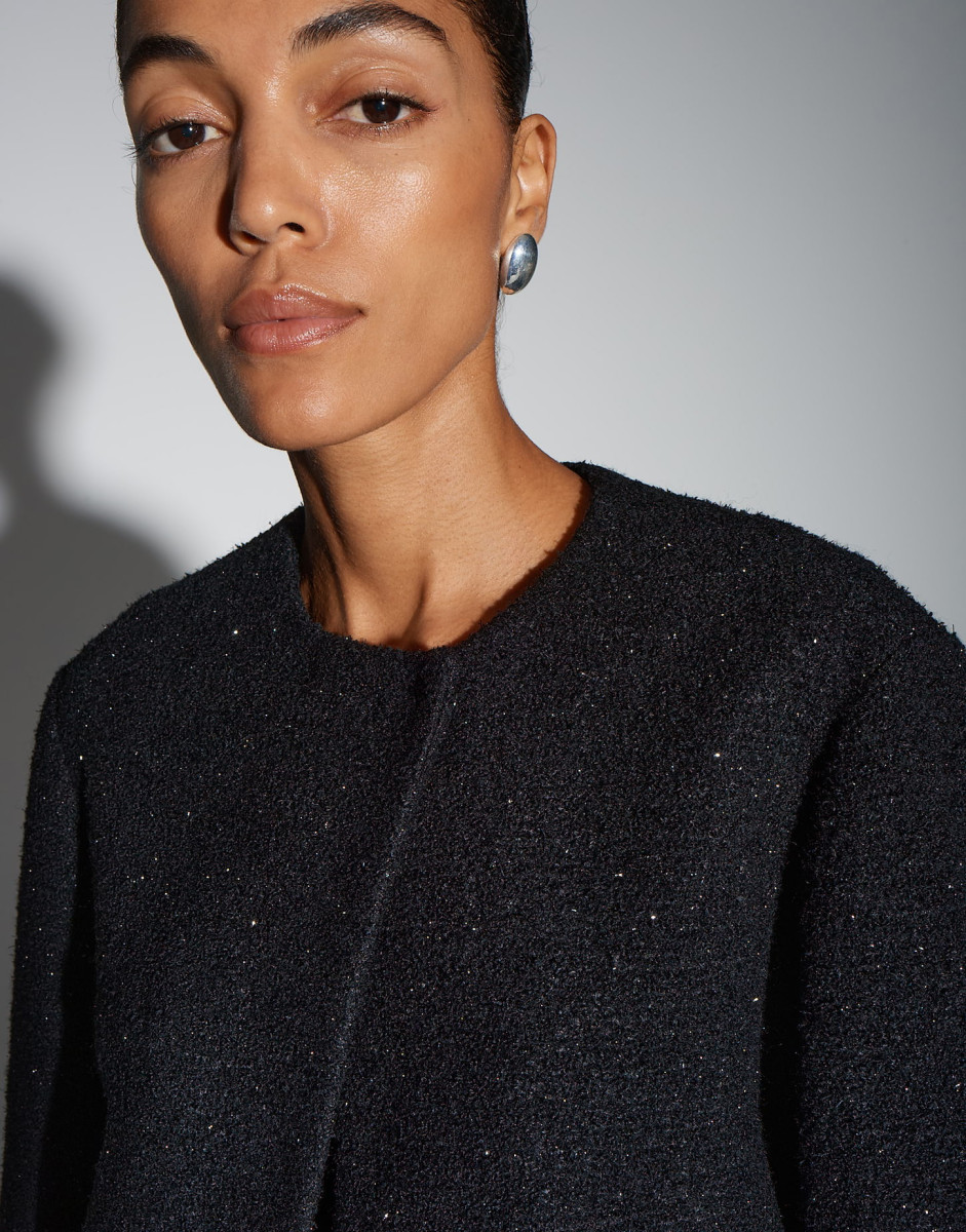 Lockere Passform | Verkürzte Länge | Langarm | Rundhalsausschnitt | Webware | Futter: Polyester | Bouclé Struktur | Natürlicher Griff | Verdeckter Druckknopf