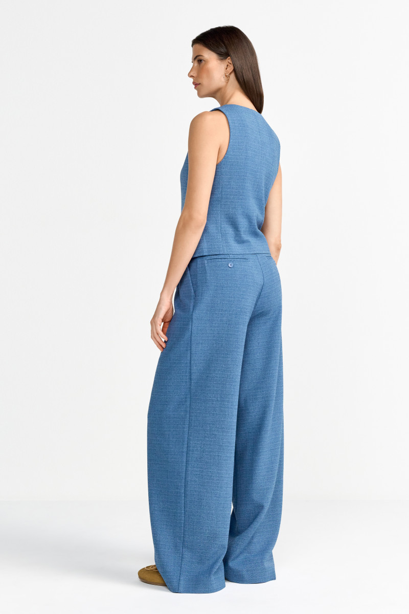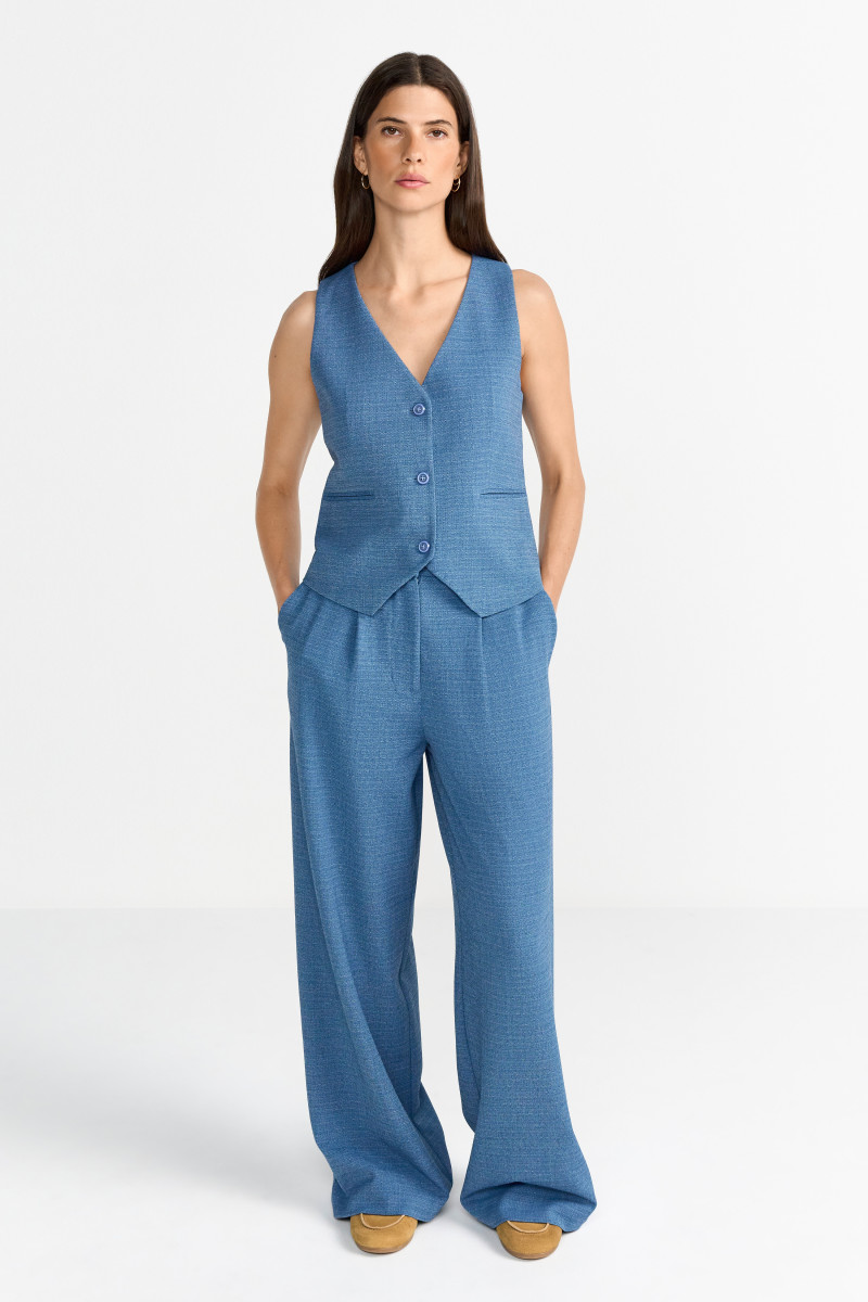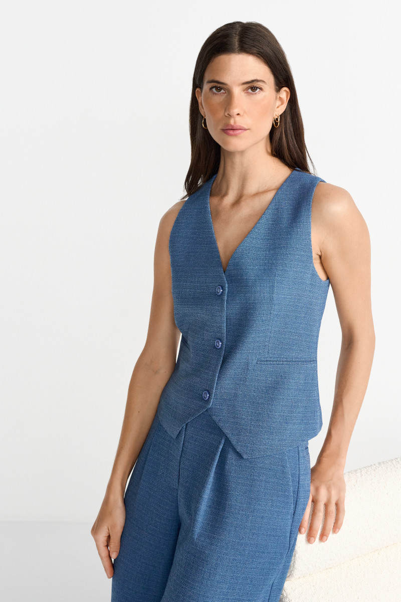 Diese ärmellose Weste überzeugt mit ihrer strukturierten Leinenoptik und einer femininen, leicht taillierten Silhouette. Der tiefe V-Ausschnitt, die klassische Knopfleiste mit drei farblich abgestimmten Knöpfen und die angedeuteten Leistentaschen sorgen für einen stilvollen Look. Der dezente Glanz des Futters auf der Innenseite rundet das Design hochwertig ab. Ob als Teil eines modernen Hosenanzugs oder lässig zu Jeans – diese Weste ist ein vielseitiges Key-Piece für stilvolle Outfits.