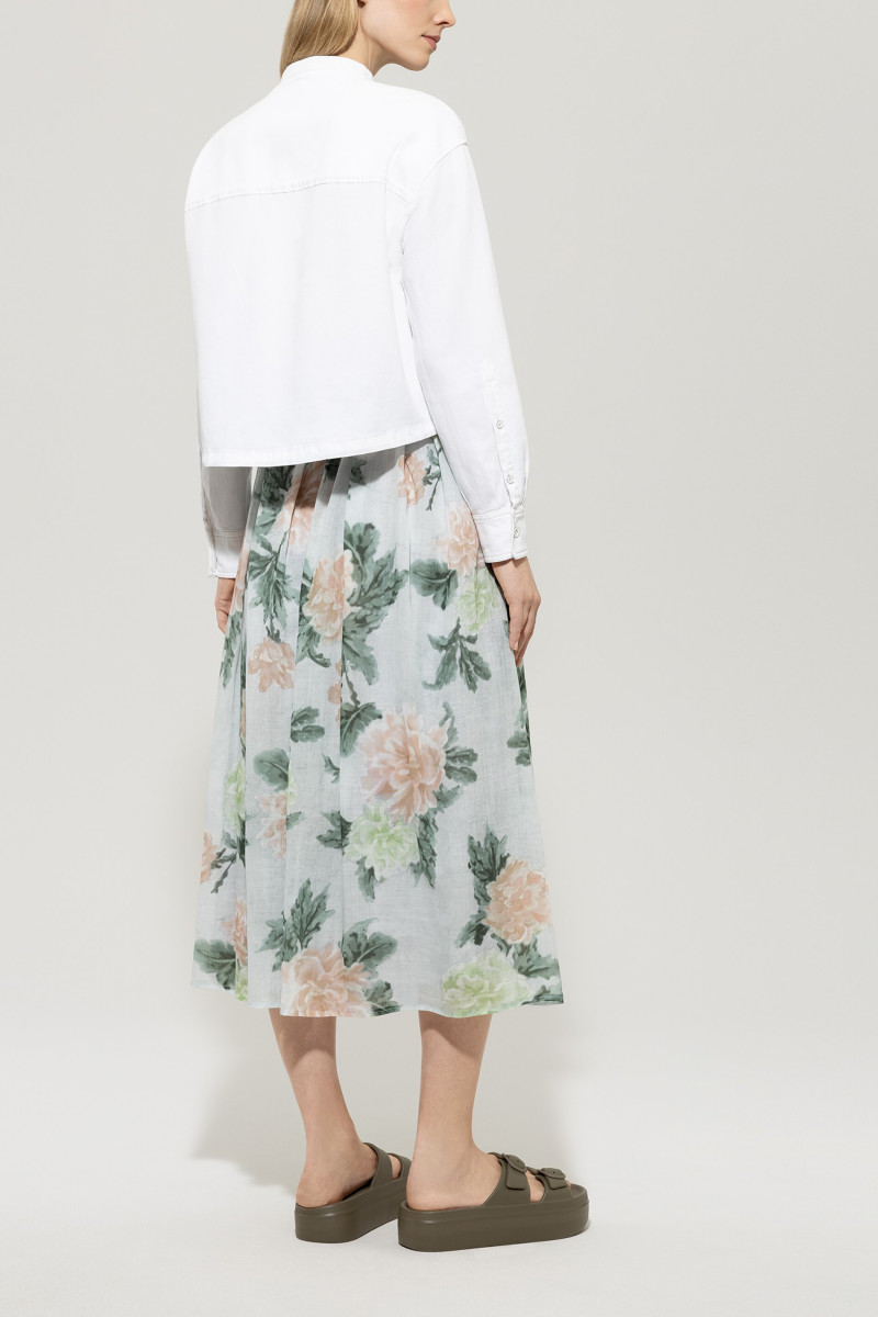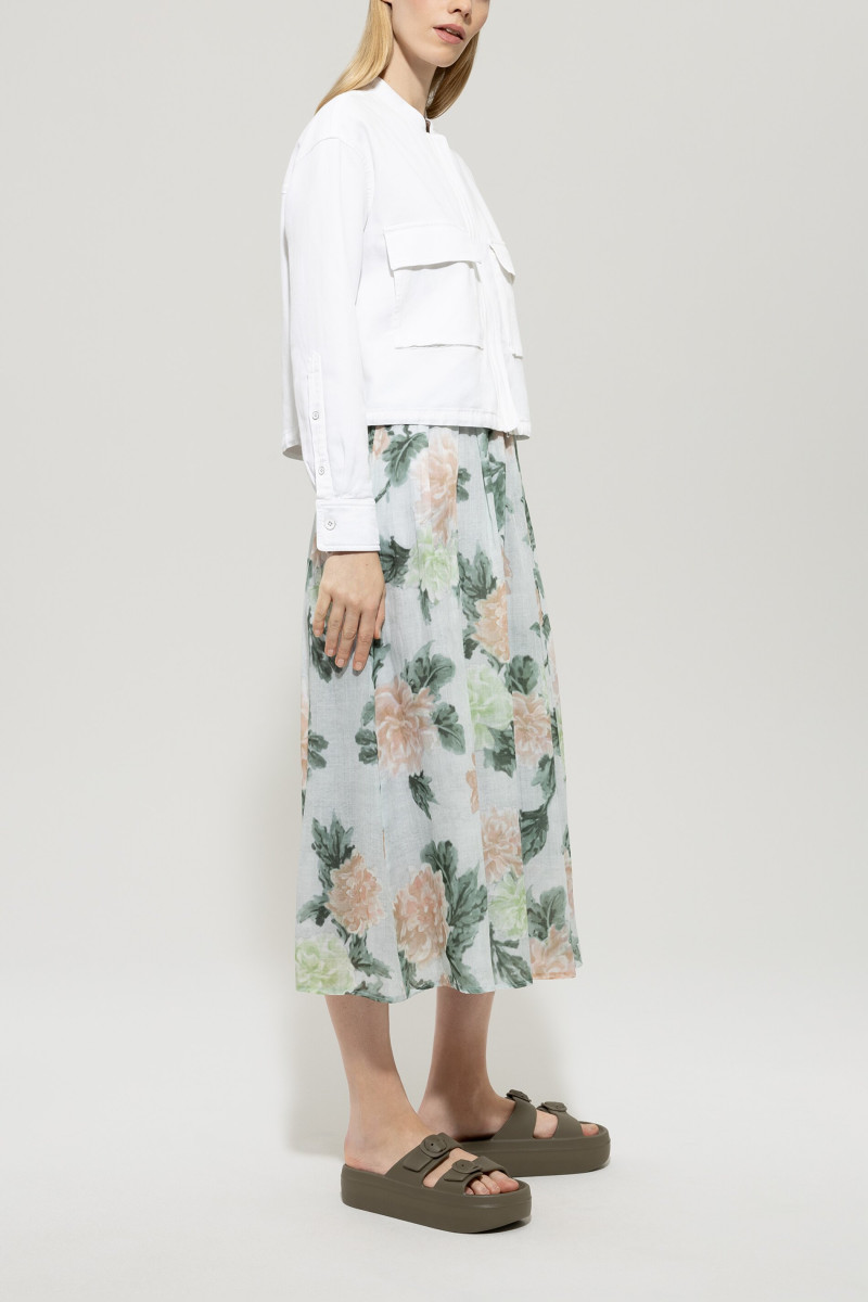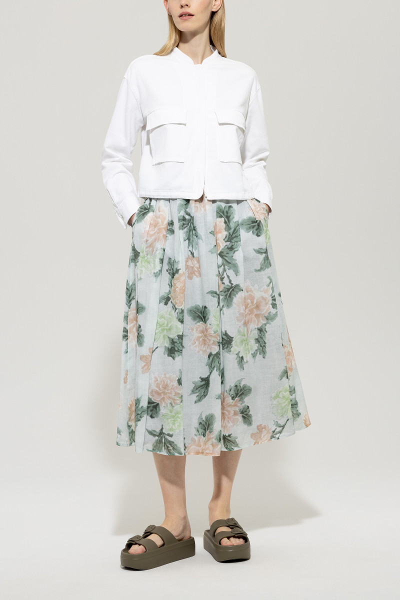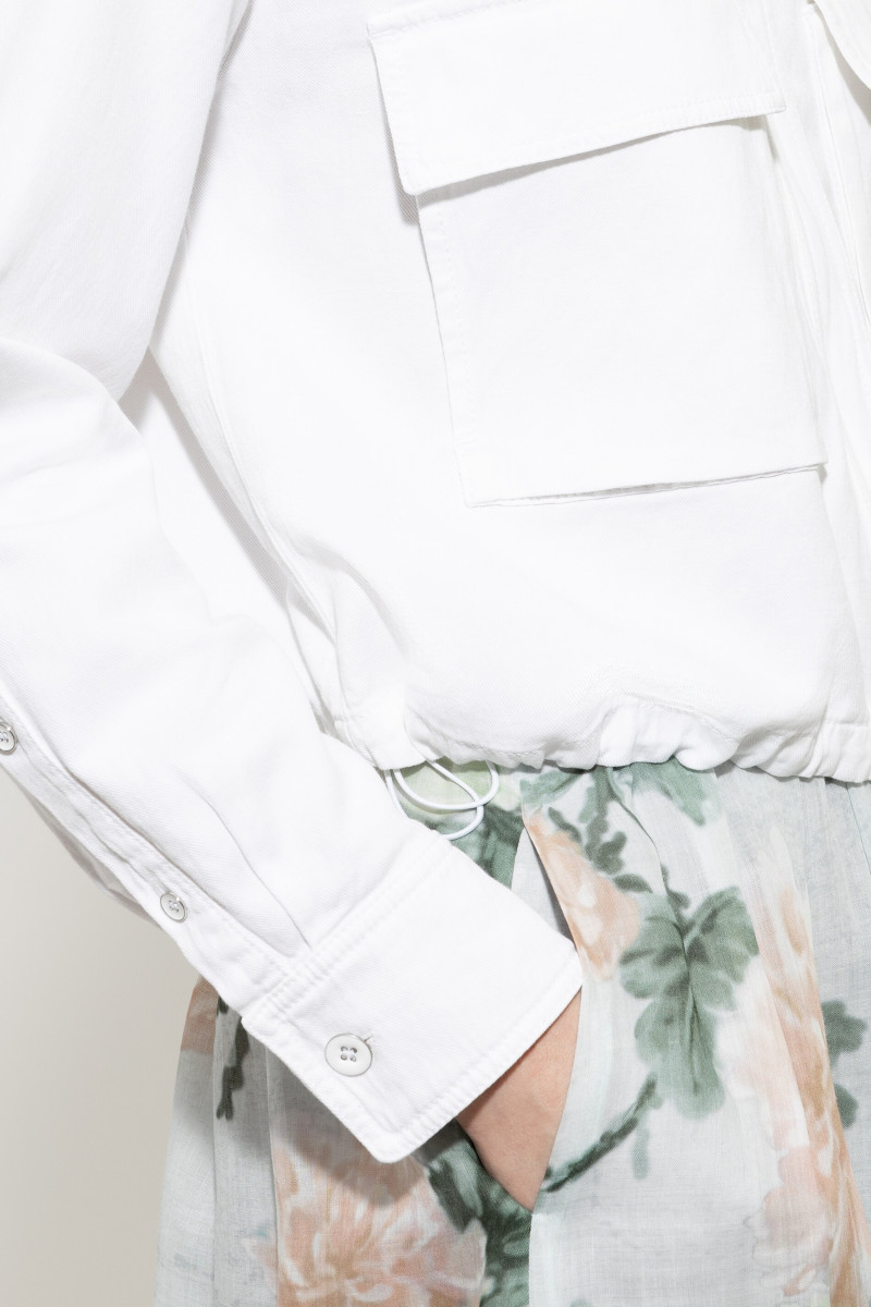 Blouson aus gefärbtem Baumwoll-Leinen-Denim in verkürztem Schnitt mit zentralem Reißverschluss. Auf der Vorderseite befinden sich zwei aufgesetzte Taschen, die Ärmelabschlüsse sind mit Schmuckknöpfen besetzt und der Saum kann per Gummizug verstellt werden.