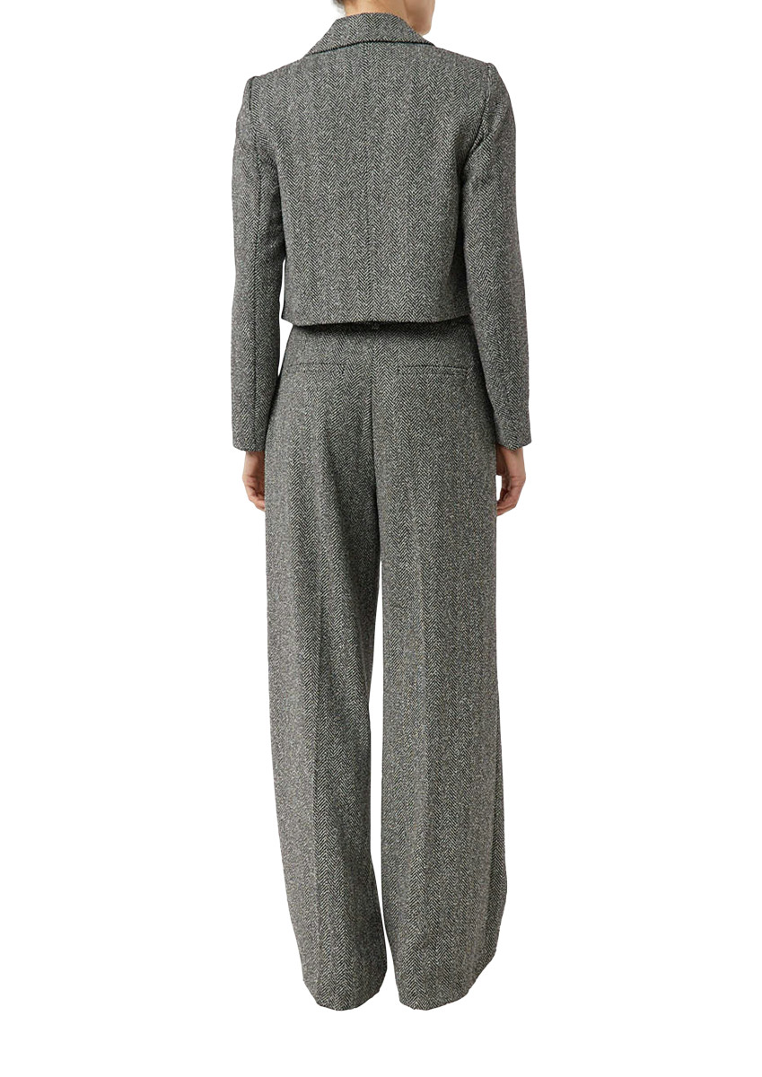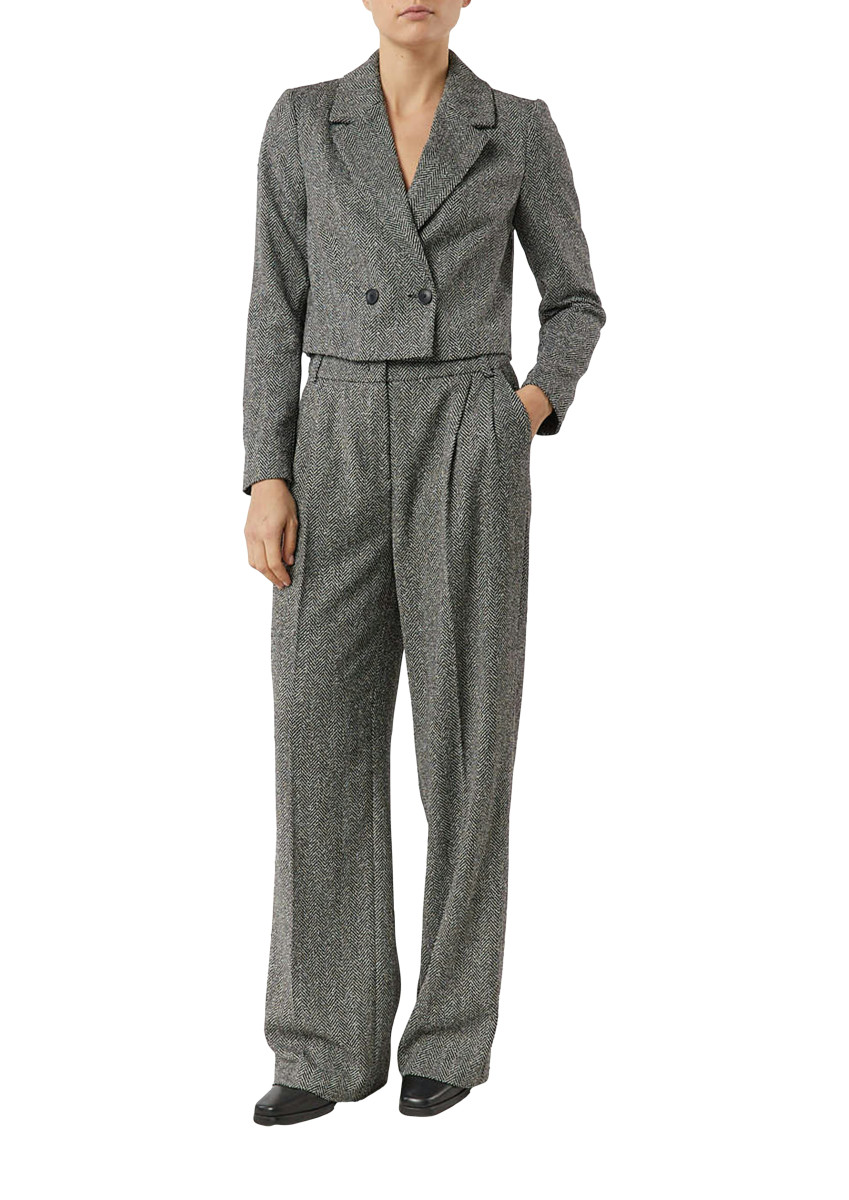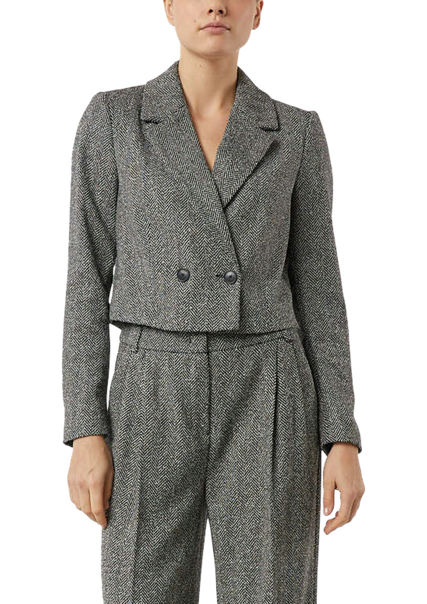 Der verkürzte Blazer im klassischen Herringbone-Muster vereint zeitlose Eleganz mit moderner Schnittführung. Die hochwertige Webware fällt fließend und schmeichelt der Figur, während der Reverskragen einen femininen Akzent setzt. Die leichte Fütterung garantiert angenehmen Tragekomfort, wodurch er sich mühelos up- oder downdressen lässt. Perfekt für Business-Looks mit Marlene-Hose oder lässig zur Jeans kombiniert – ein vielseitiges Essential, das Professionalität und Stil ausstrahlt.
