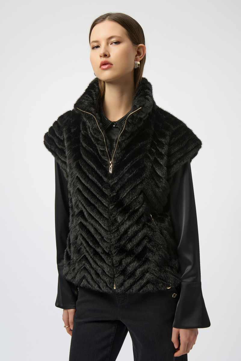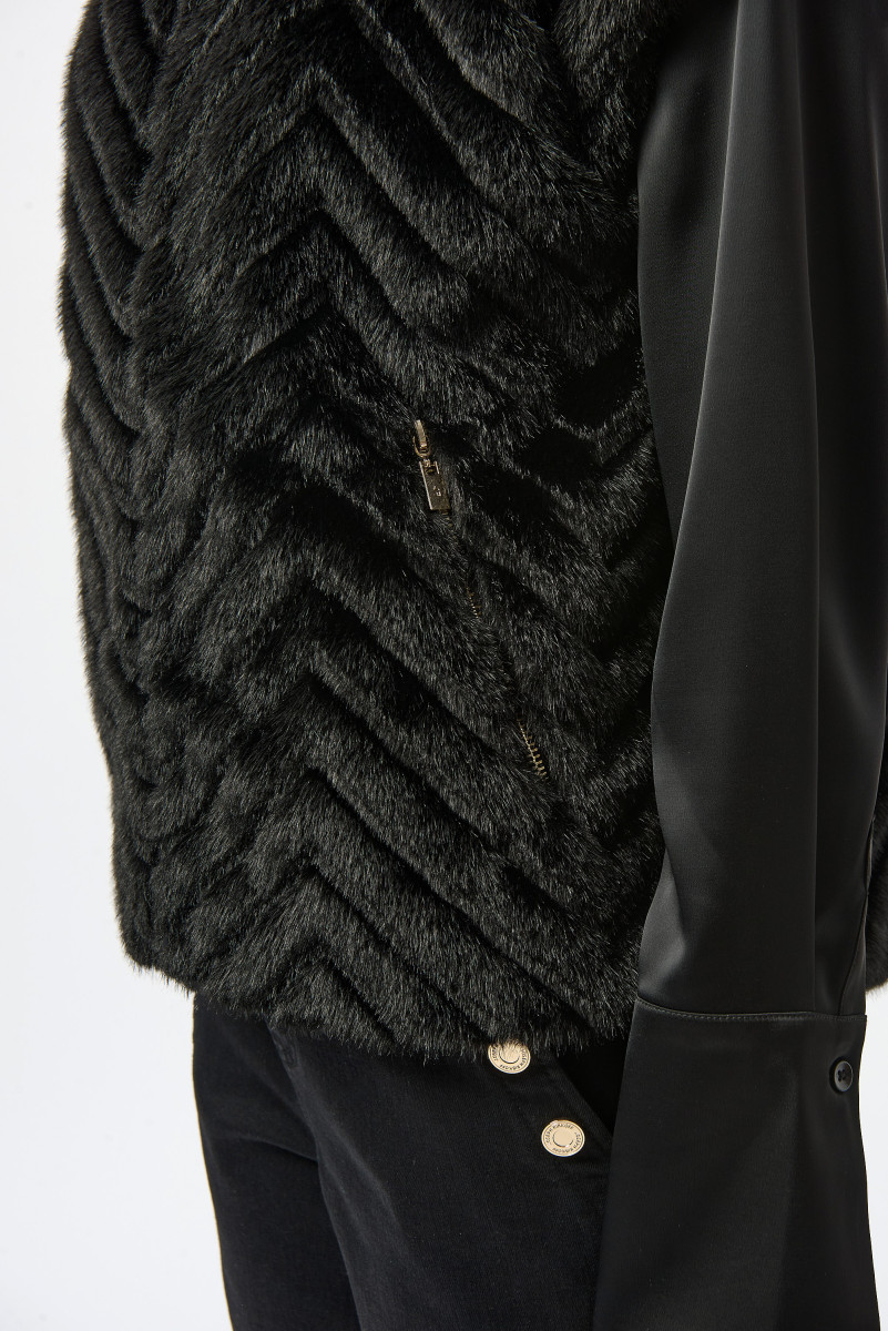 Mit dieser schicken Kunstpelzweste mit auffälligem Zackenprint setzen Sie ein modisches Statement, das gewagt und raffiniert wirkt. Mit seinem eleganten Reißverschluss, den kurzen Ärmeln und dem raffinierten Stehkragen ist sie ein echter Hingucker, der jedes Outfit perfektioniert.