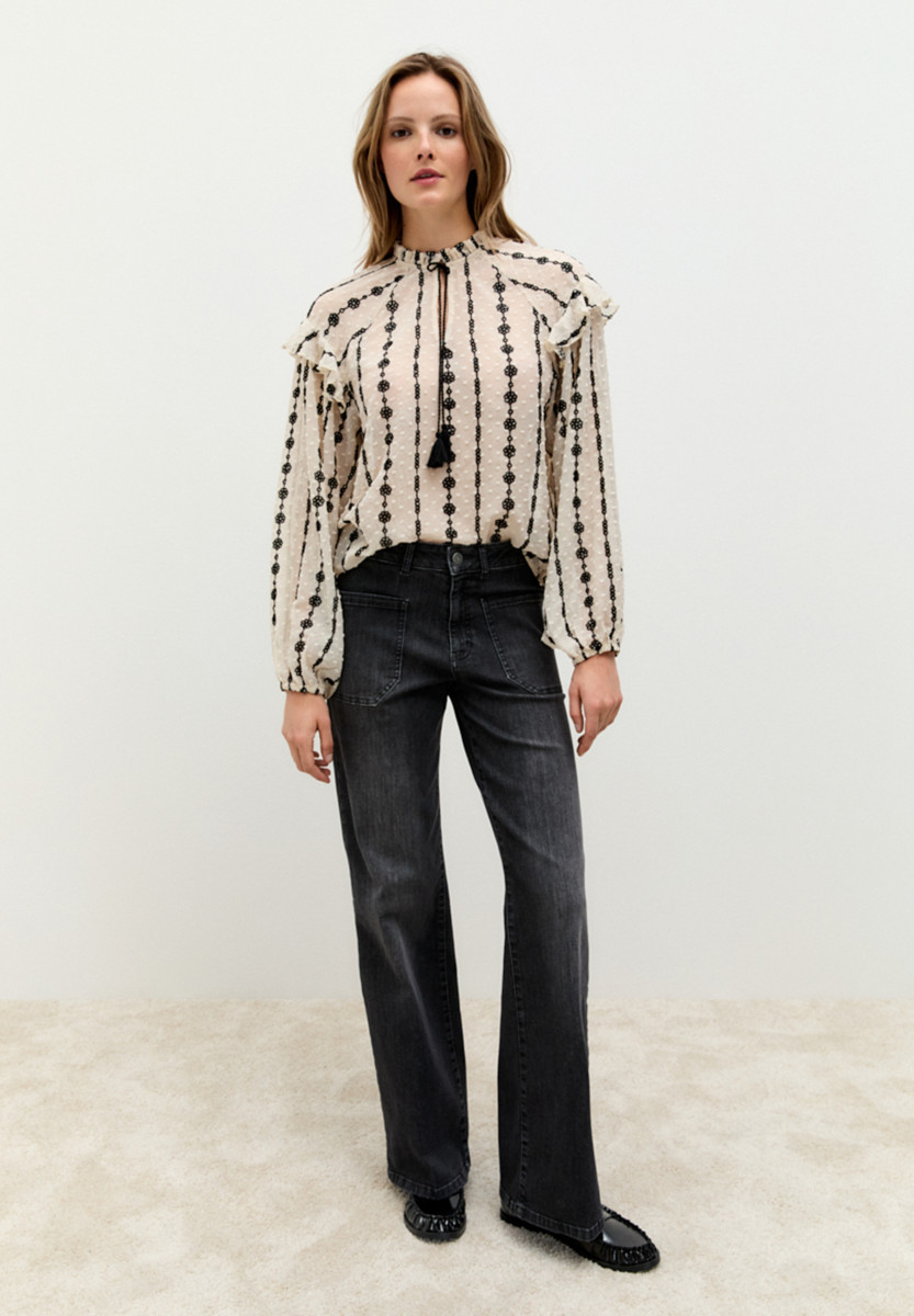 Die feminine Chiffonbluse von MORE & MORE begeistert mit liebevollen Details und bietet dank der lockeren Passform ein angenehmes Tragegefühl. Verspielte Rüschenkanten an Ärmel und Auschnitt setzen romatische Akzente, während die Kordel am Auschnitt mit dekorativen Tasseln für einen Hauch Boho-Flair sorgt. Die fließende Chiffonqualität mit kontrastfarbiger Stickerei verleihen der Bluse einen sehr edlen Look - perfekt für einen stilvollen Auftritt.