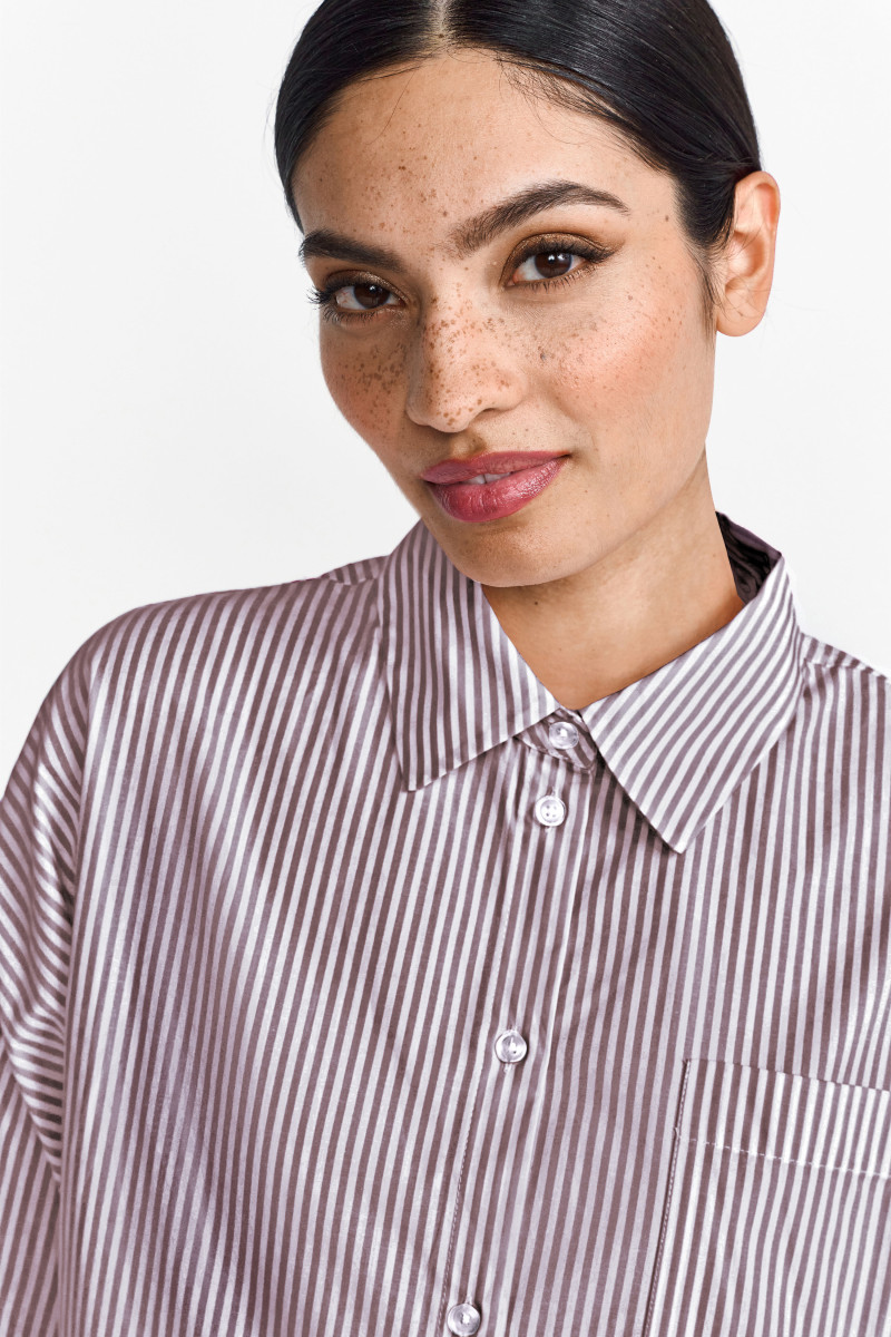 Verleihen Sie Ihrer Garderobe einen zeitlosen Klassiker mit unserem gestreiften Oversized Hemd. Mit seinem klassischen Streifenmuster in sanften Rottönen und Weiß bietet dieses Hemd eine elegante und vielseitige Option für jede Gelegenheit. Die lockere Passform und der breite Schnitt sorgen für ultimativen Komfort, während die Kragengestaltung und die knöpfbare Front den klassischen Hemd-Look perfekt abrunden.