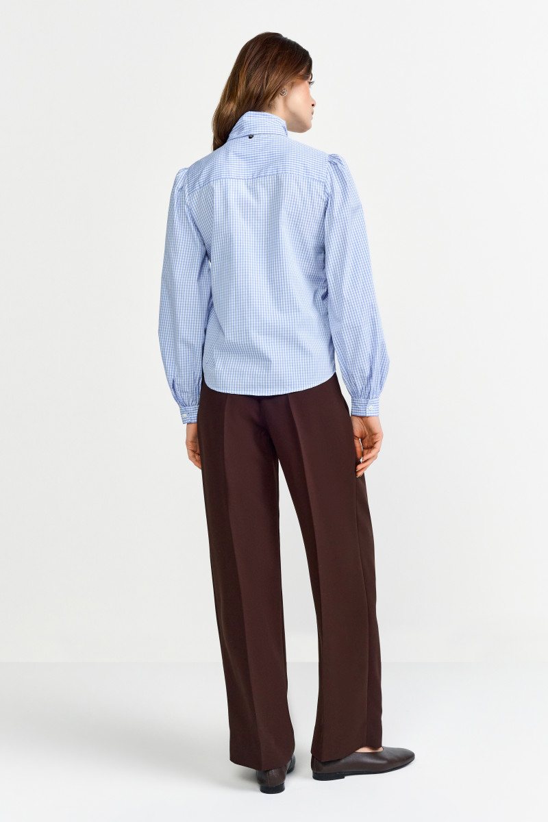 Unsere elegante Bluse im zeitlosen Karomuster aus hochwertiger Baumwolle überzeugt mit einem femininen Schnitt und einem modischen Schleifenkragen, der dem klassischen Design eine charmante Note verleiht. Die langen, leicht gerafften Ärmel sorgen für ein weich fließendes Tragegefühl, während die Knopfleiste vorne das Design harmonisch abrundet. Perfekt kombinierbar zu Jeans oder Röcken für einen lässigen bis schickeren Look – ideal für das Büro, besondere Anlässe oder den täglichen Alltag.
