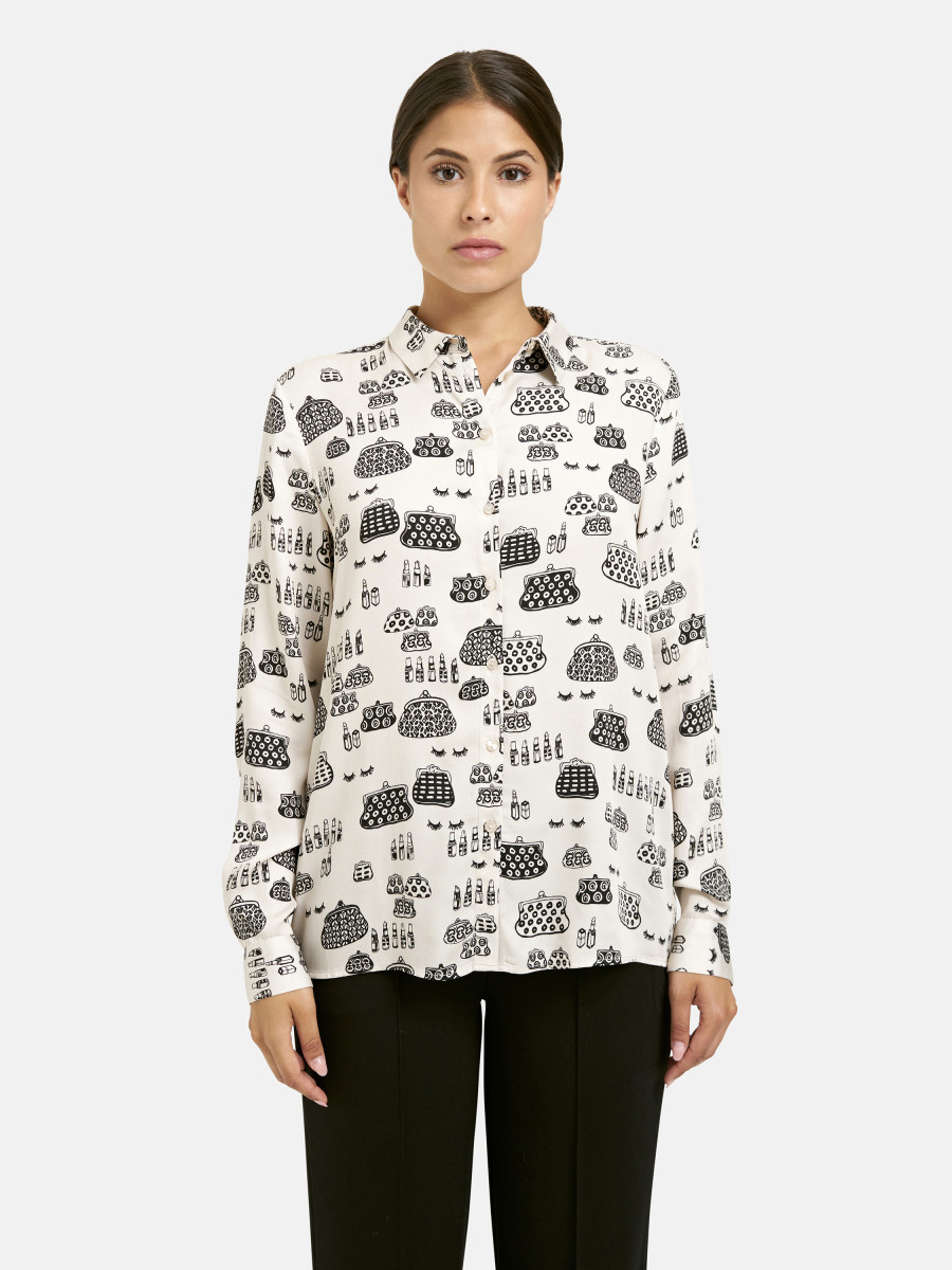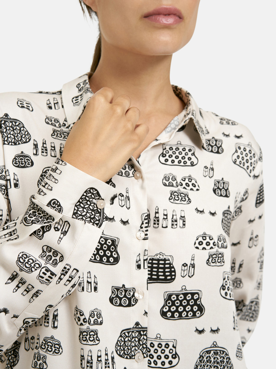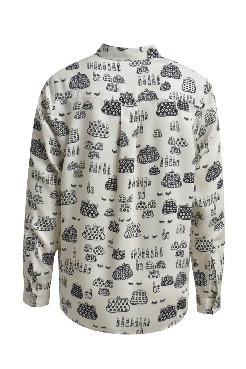 Diese Bluse ist mehr als nur ein Basic – sie ist ein modisches Statement für Individualistinnen mit einem Auge fürs Detail. Der einzigartige Allover-Print aus Schminktäschchen, Lippenstiften und Wimpern verleiht dem klassischen Schnitt eine humorvolle und kreative Note – perfekt für alle, die Mode mit einem Augenzwinkern tragen möchten.