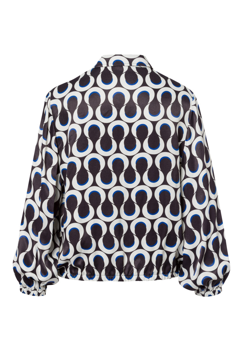 Das leicht glänzende Material verleiht der Bluse eine luxuriöse Note, während der klassische Hemdkragen und die durchgehende Knopfleiste für einen eleganten Rahmen sorgen. Der elastische Saum und die leicht voluminösen Ärmel mit Manschetten kreieren eine moderne, leicht sportive Silhouette. Kombinieren Sie diese Blusenjacke zu schlichten Hosen oder Röcken, um dem Muster die volle Aufmerksamkeit zu schenken