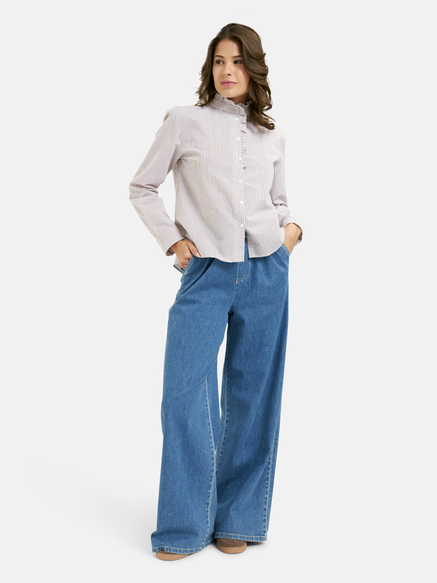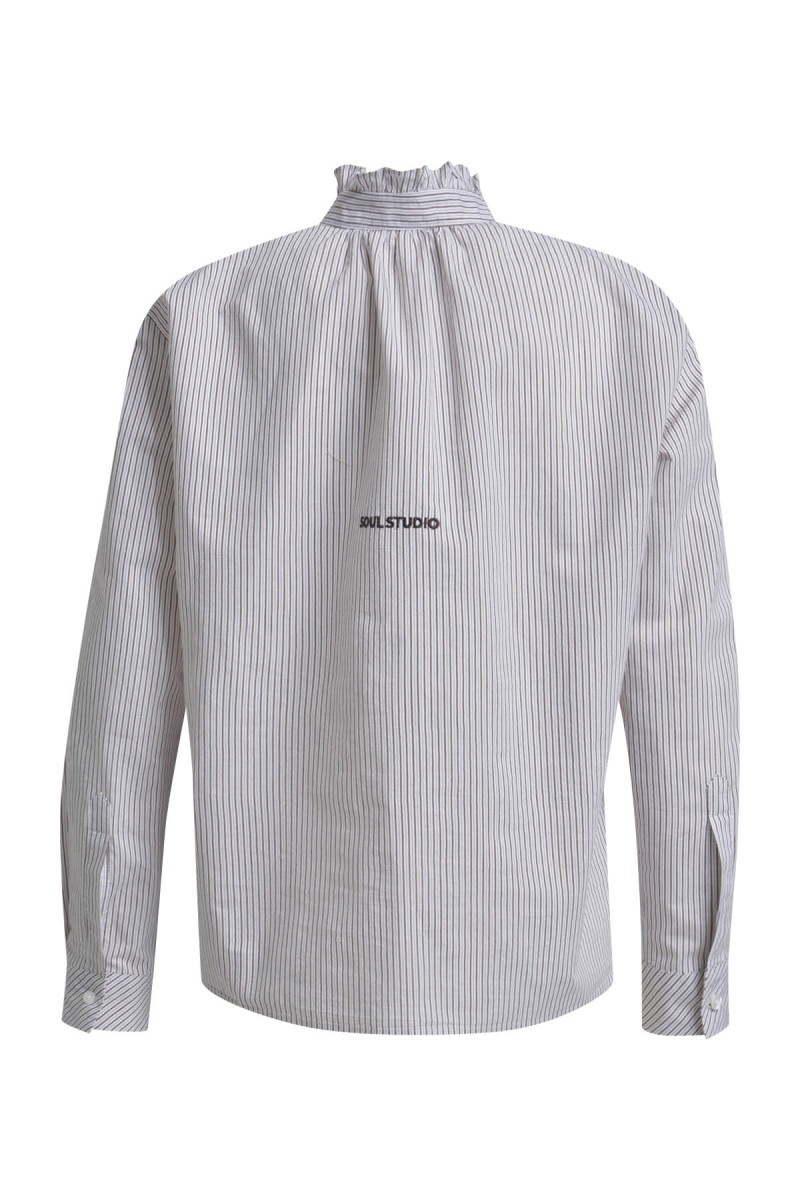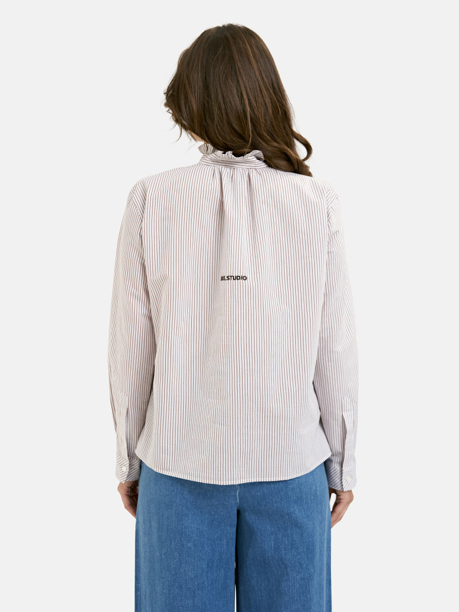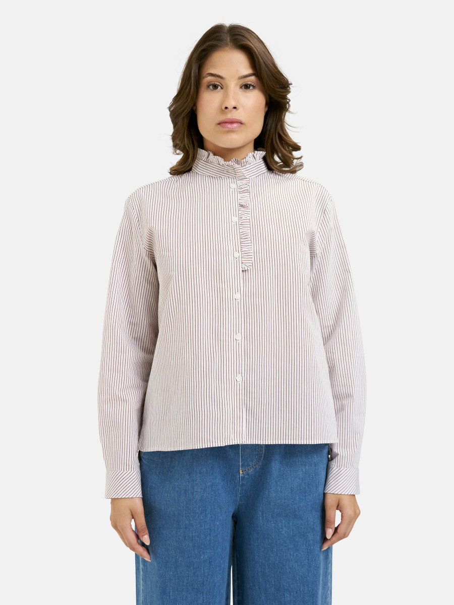 Das herausragende Merkmal dieser Damen-Bluse ist der hochgeschlossene, gesmokte Stehkragen, der mit einer feinen Rüschenkante verziert ist. Eine zusätzliche vertikale Rüschenleiste entlang der teilweise verdeckten Knopfleiste unterstreicht den femininen und verspielten Charme dieses Oberteils.