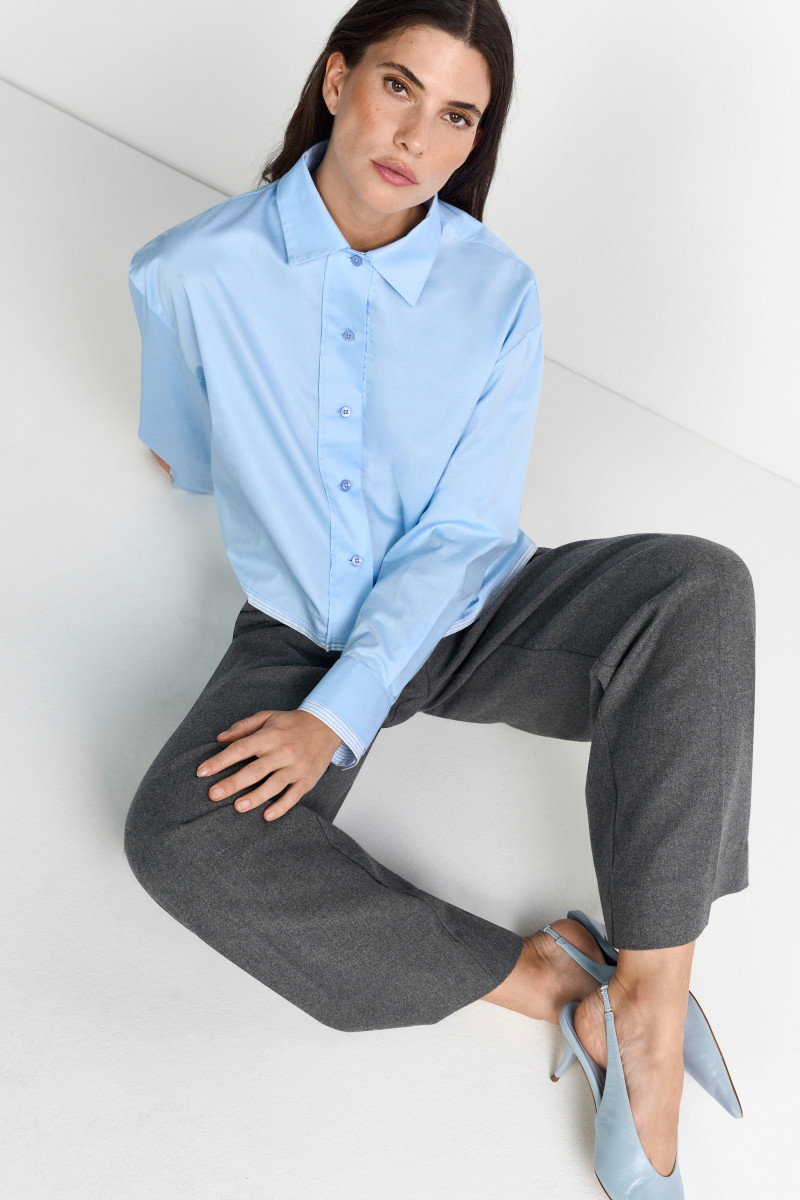 Dieses moderne Oberteil präsentiert sich in einem verkürzten, lässigen Schnitt und ist ein vielseitiges Key-Piece für stilbewusste Outfits. Gefertigt aus einem angenehmen Material, bietet die Langarmbluse optimalen Tragekomfort und eine fließende Silhouette. Der klassische Hemdkragen und die durchgehende Knopfleiste verleihen dem Design eine zeitlose Eleganz. Ein besonderer Blickfang ist der Saum, der mit einer feinen, gestreiften Kante akzentuiert ist und dem Piece eine subtile, modische Note verleiht. Die geknöpften Manschetten runden den Look ab. Perfekt für Kombinationen mit hochgeschnittenen Hosen oder Röcken, um die Cropped-Form optimal in Szene zu setzen. Ein Must-have, das sowohl im Büro als auch in der Freizeit überzeugt.