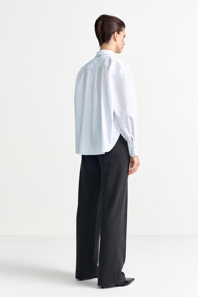 Diese moderne Langarmbluse ist ein Statement für stilvolle Garderobe. Sie vereint den klassischen Chic einer Hemdbluse mit einem Hauch von Glamour. Das zeitlose Design wird durch eine aufwendig verzierte Zierleiste entlang der Knopfleiste effektvoll akzentuiert. Funkelnde Schmucksteine in einer floralen Anordnung setzen einen luxuriösen Blickfang, der das Kleidungsstück aufwertet. Der Schnitt ist klassisch und bequem, mit einem Hemdkragen und langen Ärmeln mit Manschetten, deren Knopf ebenfalls dezent verziert ist. Eine einzelne Brusttasche rundet den traditionellen Look ab. Das Oberteil ist vielseitig kombinierbar, von eleganten Business-Outfits bis hin zu schicken Abendveranstaltungen, und verleiht jedem Look eine besondere, edle Note.