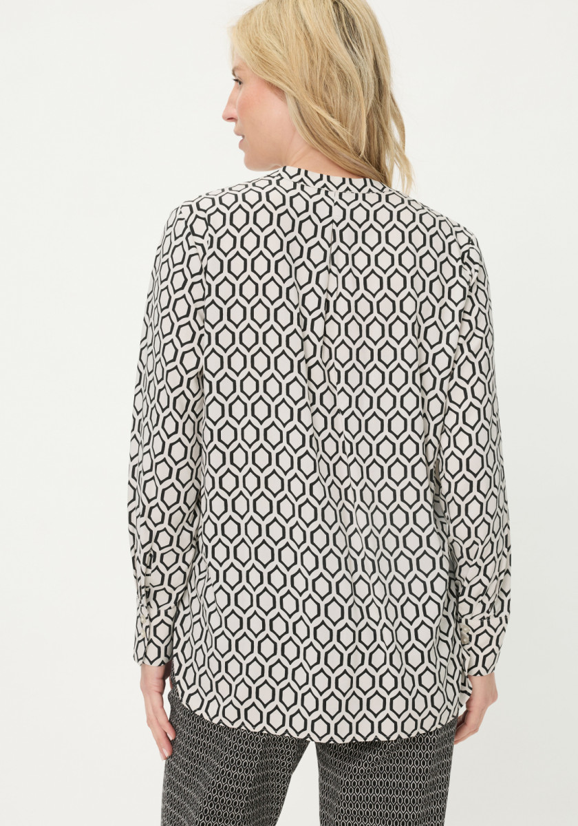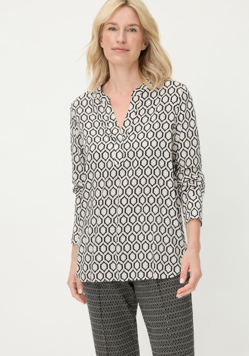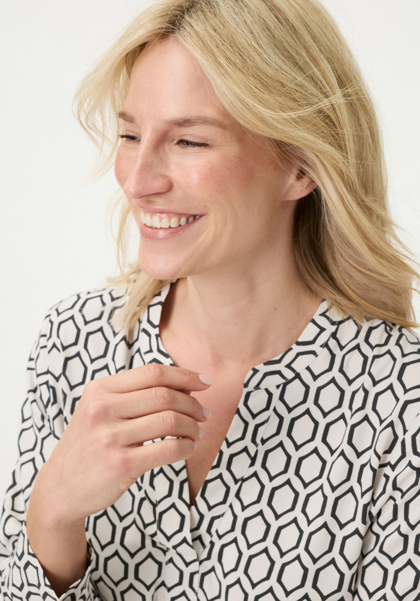 Frische Eleganz für jeden Tag: Diese Bluse bringt mit ihrem farbharmonischen Allover-Dessin stilvolle Lebendigkeit in Ihren Look. Der Tunika-Ausschnitt wirkt leger und feminin zugleich, während die langen Ärmel mit Manschetten und Schlitz ein raffiniertes Detail setzen. Die weich fließende Qualität aus reiner Viskose sorgt für ein besonders angenehmes Tragegefühl. Bonus: Dieser Style enthält LENZING™ ECOVERO™ Viskose, die aus kontrollierten Holzquellen gewonnen wird. LENZING™ und ECOVERO™ sind Marken der Lenzing AG. Länge ca. 68 cm.