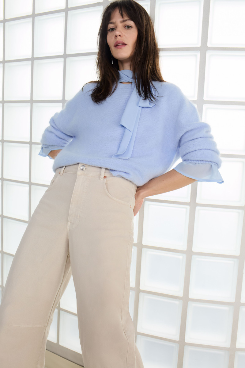 Transparenter Chiffon A-Shape, in verkürzter Länge Kurzer Stehkragen mit V-Ausschnitt und Schluppe Leicht überschnittene Schulter mit Langarm Ärmel mit Gummibündchen und Volant Hohe angesetzte Rüsche am Saum * Länge bei Größe 36: 58cm