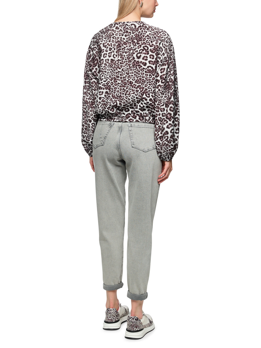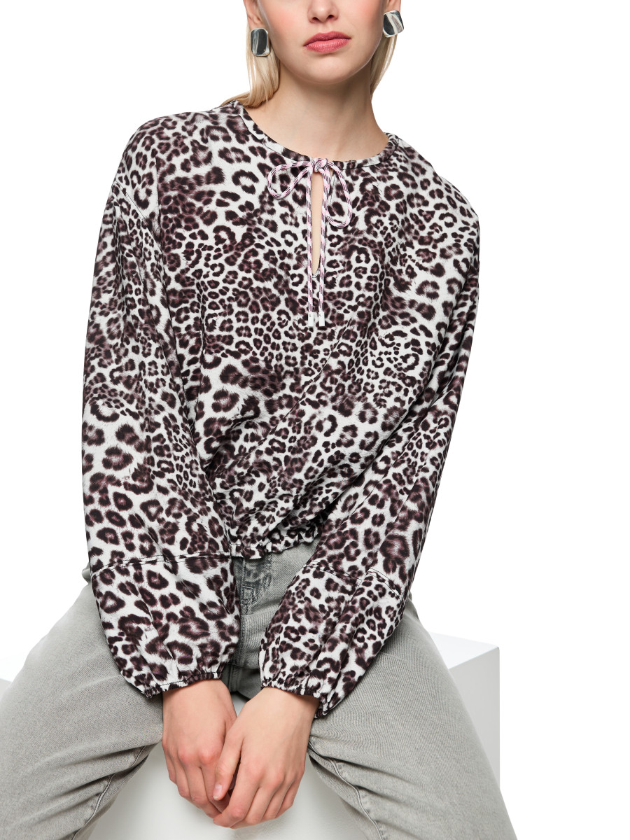 Bluse mit Leo Print|Lockere Bluse mit modernem Leomuster. Die Bluse überzeugt mit ihrem weiten Schnitt und der leicht verkürzten Form. Das macht sie zu einem stylischen Begleiter für jeden Anlass. Am Saum befinden sich eingearbeitete Gummizüge, wodurch die Weite individuell angepasst werden kann. Weiteres Detail ist der V-Ausschnitt mit Kordelzug, der der Bluse einen sportlichen Touch verleiht. Der luftig-lockere Viskosemix liegt angenehm weich auf der Haut.|Weiter Schnitt|Leicht verkürzt|Mit Gummizug|Viskose-Mix|Das Model ist 179 cm groß und trägt N3/38.