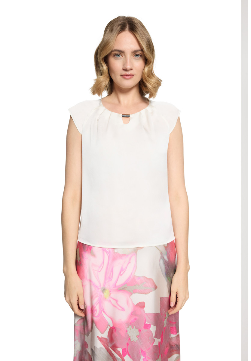 Diese Bluse präsentiert sich in einer legeren Oversized-Passform mit rundem Ausschnitt und überschnittenen Kurzärmeln. Der Satin-Stoff verleiht ihr eine edle Optik, die Gesamtlänge beträgt 58 cm und die Länge ab Taille 16 cm, während ein dekoratives Detail am Ausschnitt für einen Blickfang sorgt. Der verschlusslose Schnitt ermöglicht einfaches An- und Ausziehen und macht die Bluse vielseitig kombinierbar für Büro- und Freizeitlooks.Lief.-Art-Nr: 03904098