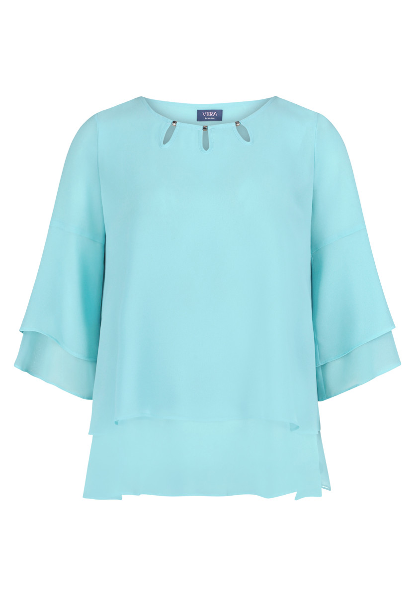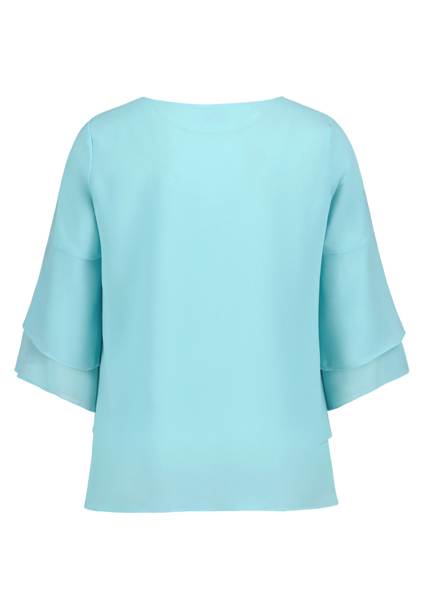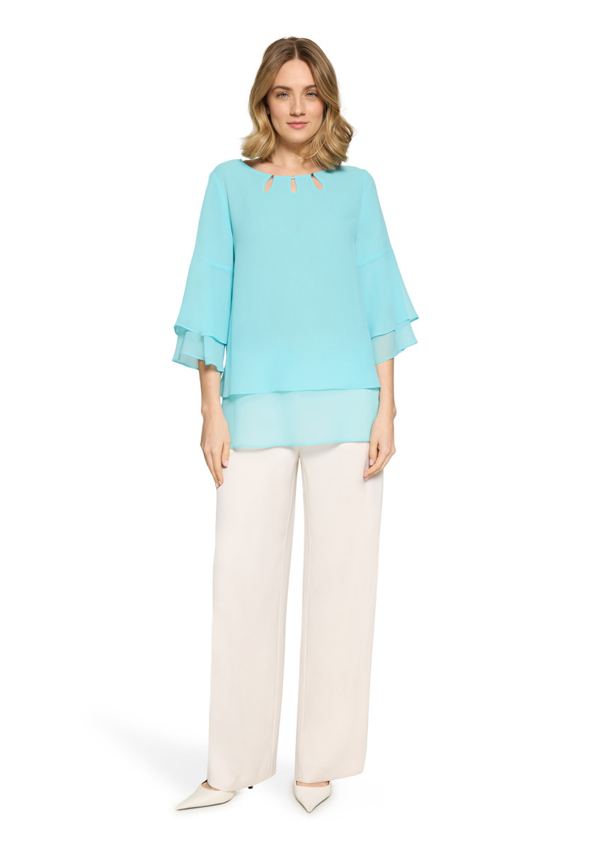 Diese figurumspielende Bluse überzeugt mit ihrem leichten Fall und femininer Silhouette. Die 3/4-Ärmel mit Volants und der Rundhalsausschnitt setzen elegante Akzente, während die Gesamtlänge von 72 cm für eine moderne Passform sorgt. Ohne Verschluss und uni gehalten, ist die Bluse aus Polyester gefertigt und lässt sich vielseitig kombinieren.Lief.-Art-Nr: 40044000
