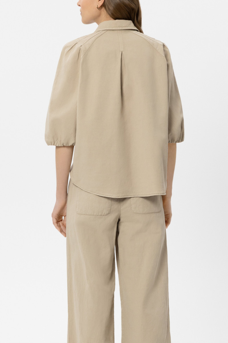 Bluse aus sommerlicher Baumwoll-Leinen-Mischung in hochwertiger RFD-Qualität mit dekorativen Metallknöpfen und Faltendetails. Die kurzen, volumigen Ärmel zeigen elastische Abschlüsse.