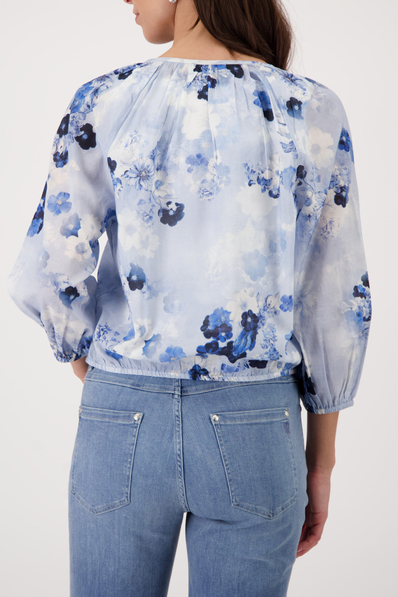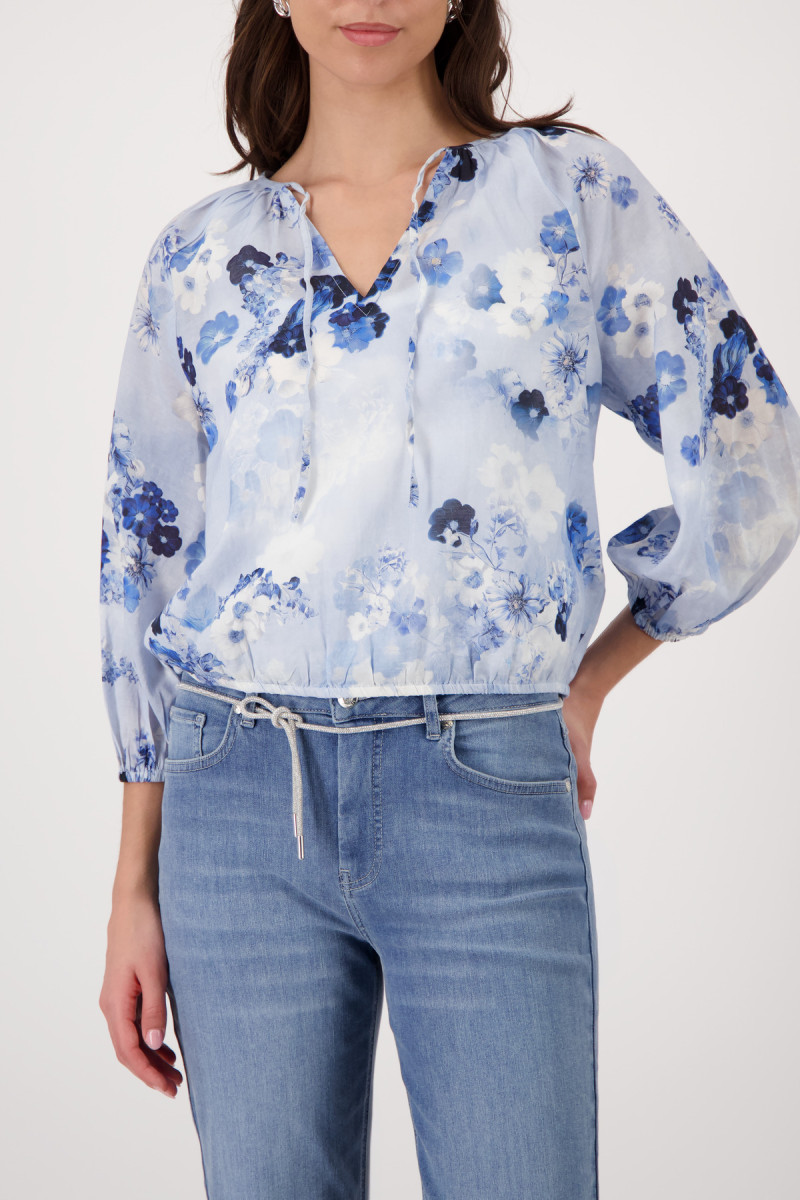 Elegante Bluse aus hochwertiger Baumwolle und fließender Viskose, verziert mit einem floralen Muster und verspielten Kräuseldetails.Lief.-Art-Nr: 410780
