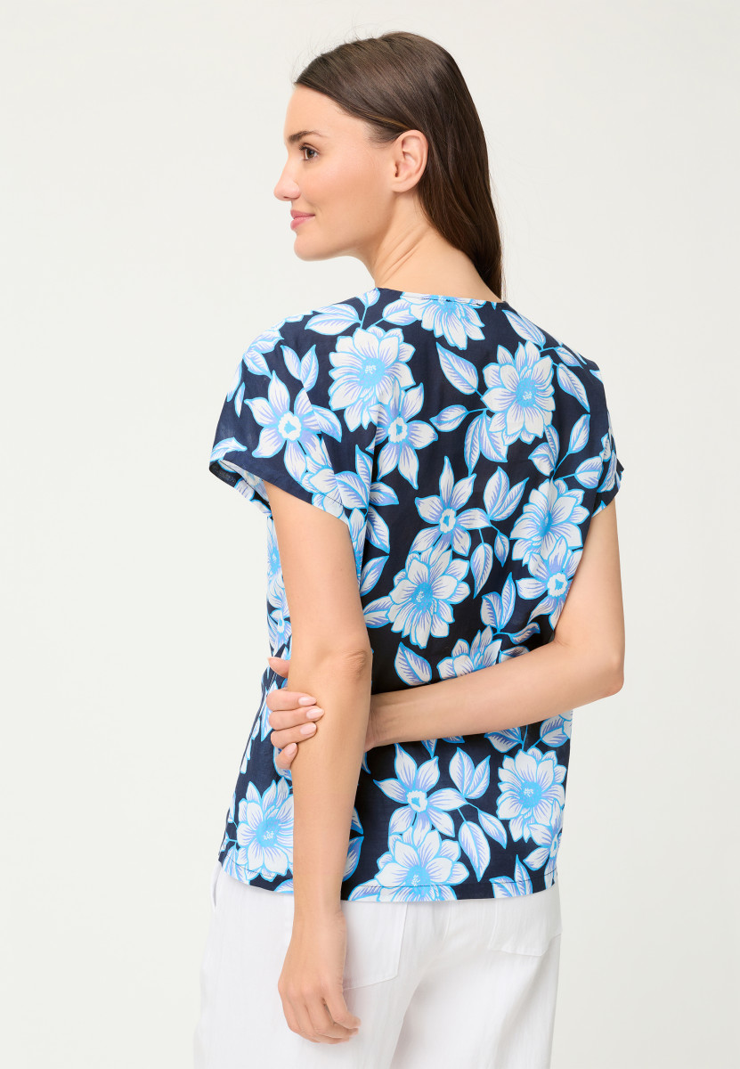 Das Allover-Dessin verleiht dieser Bluse eine lebendige, zugleich harmonische Ausstrahlung. Der V-Ausschnitt setzt einen femininen Akzent, während die kurzen Kimonoärmel mit Umschlag dem Modell eine entspannte Leichtigkeit geben. Gefertigt aus reiner Baumwolle, trägt sich die Bluse angenehm leicht und sorgt für ein natürliches Hautgefühl. Die klare Linienführung macht sie zu einem vielseitigen Stylingpartner für gepflegte Casual-Looks und sommerliche Outfits.