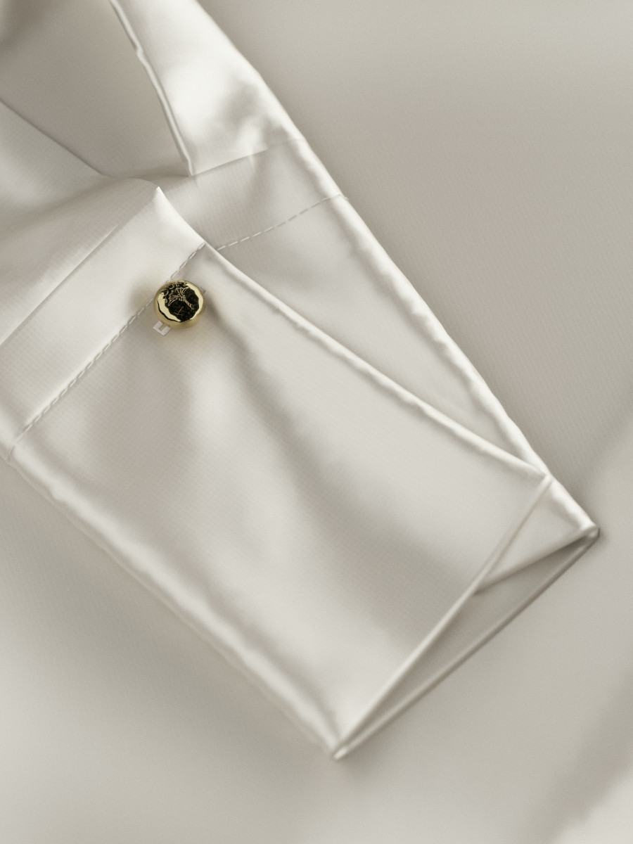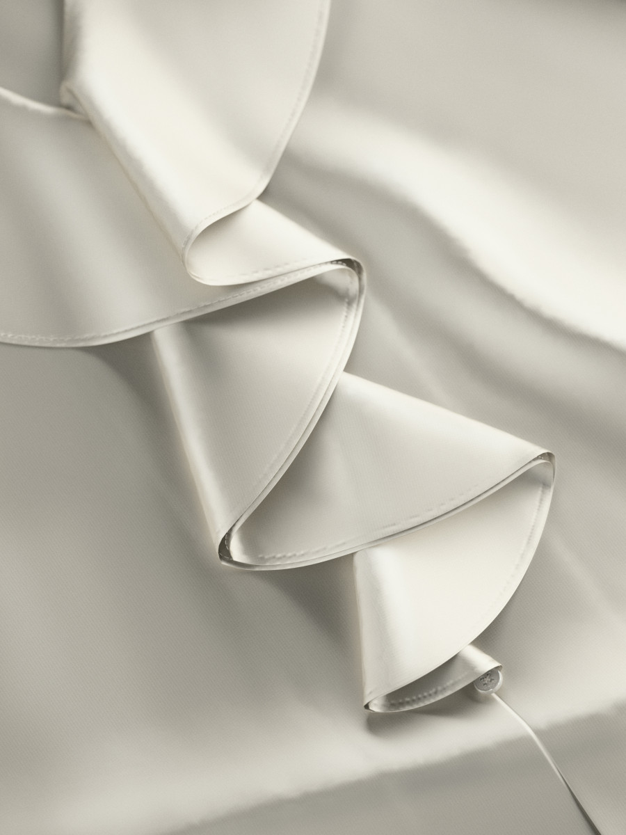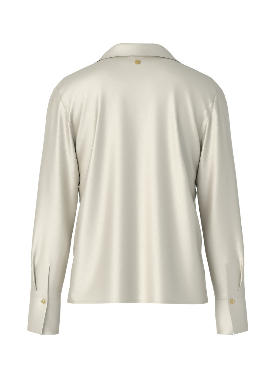 Der klassische Schnitt mit langen Ärmeln und Manschetten verleiht der Bluse Struktur, während der leichte Glanz des Materials edel wirkt und jede Bewegung sanft unterstreicht. Ob zu einem Blazer, einer Stoffhose oder einem Rock – mit dieser Bluse verleihst du deinem Outfit das gewisse Extra.