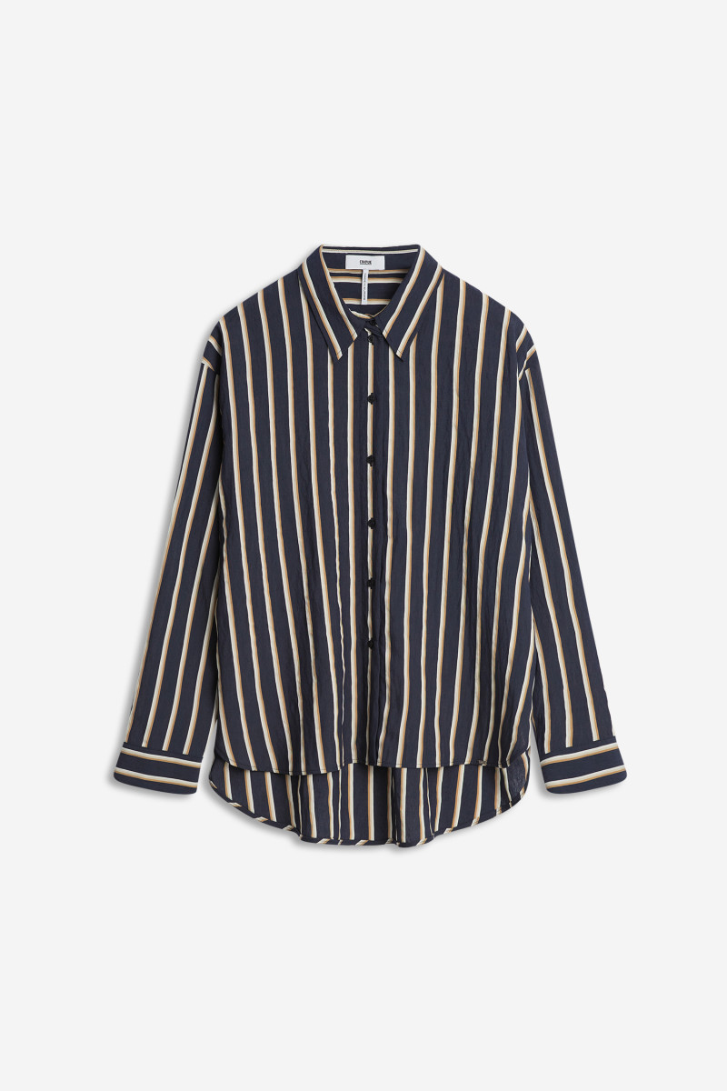 Zeitlose Hemdbluse mit durchgehender Knopfleiste, Kragen und längerer Rückenpartie. Der abgerundete Saum und die klare Linienführung machen sie zum vielseitigen Begleiter für Büro und Alltag - lässig über die Hose oder schick in den Rock gesteckt tragbar.