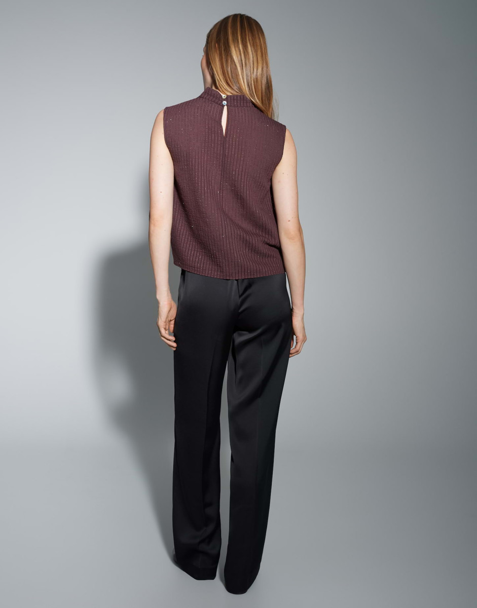 Der Schnitt ist gerade und fließend, mit einer klassischen, ärmellosen Form, die sich hervorragend zum Tragen unter Blazern, Cardigans oder Solo an wärmeren Tagen eignet. Ob im Büro, zu festlichen Anlässen oder schick kombiniert zur Jeans – dieses Top verleiht jedem Outfit mühelos eine elegante und gepflegte Ausstrahlung. Ein vielseitiges Essential, das Stil und Textur in Ihre Garderobe bringt.