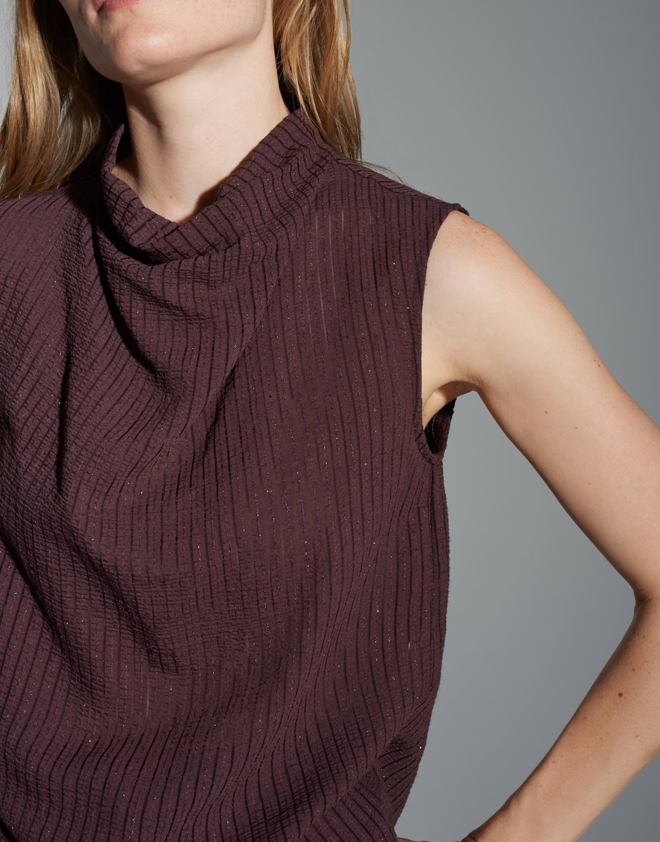 Dieses elegante, ärmellose Oberteil ist ein raffiniertes Basic für stilvolle Looks. Es besticht durch seine strukturierte Oberfläche, die eine subtile, vertikale Rippen- oder Crêpe-Textur aufweist und dem Material einen schönen Fall verleiht.