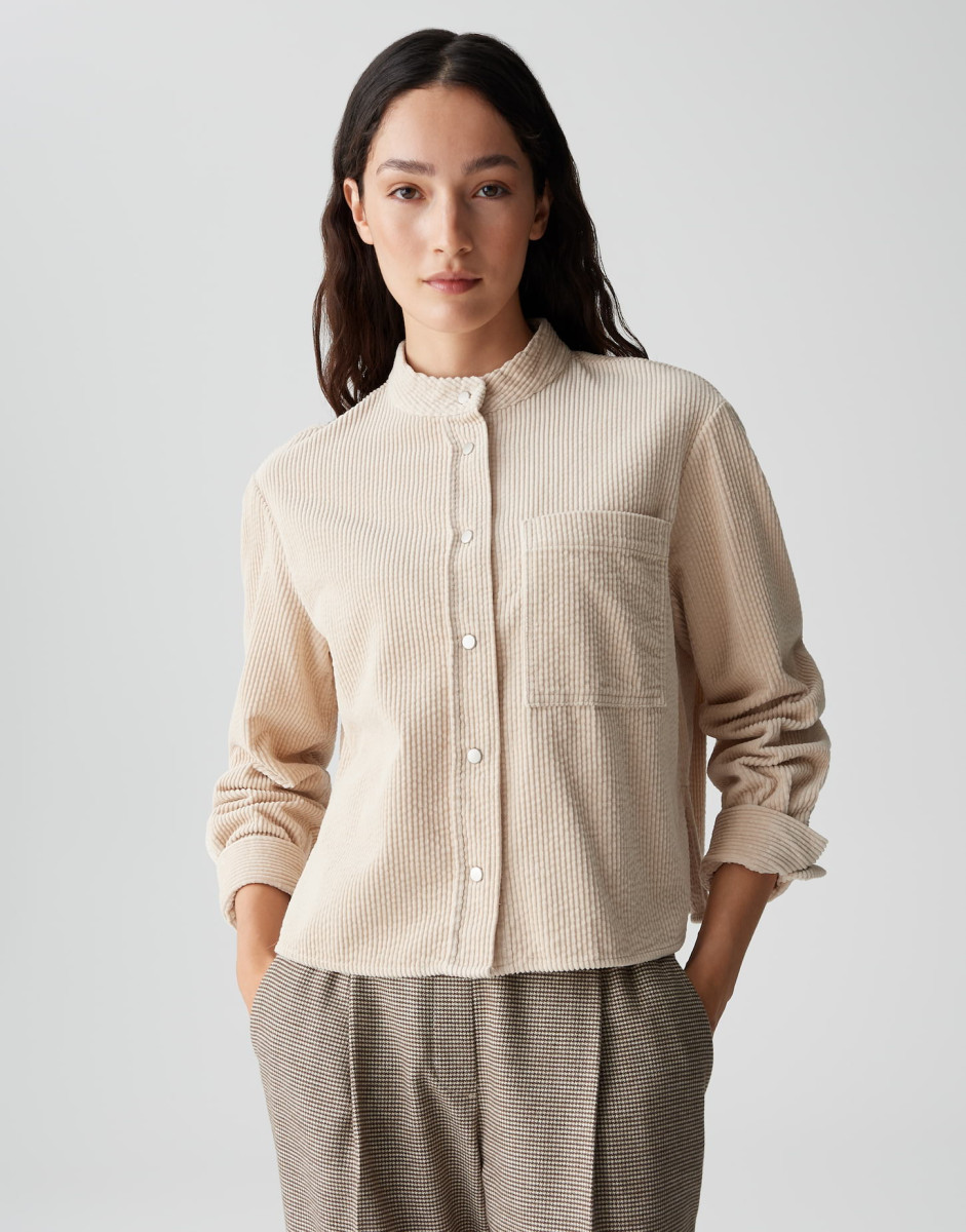 Diese trendige Hemdbluse überzeugt mit ihrer hochwertigen Cord-Textur, die dem Oberteil eine lässige und zugleich edle Note verleiht. Das Material ist weich im Griff und sorgt für ein angenehmes Tragegefühl. Das Design zeichnet sich durch einen modernen Stehkragen und eine durchgehende Knopfleiste aus. Eine aufgesetzte Brusttasche ergänzt den entspannten Look. Die Ärmel sind voluminös geschnitten und enden in breiten Manschetten, die dem Stil eine modische Weite geben. Die verkürzte Länge der Bluse macht sie zu einem idealen Kombinationspartner für hoch geschnittene Hosen und Röcke. Dieses vielseitige Stück ist perfekt für einen stilvollen Übergangs-Look und bringt eine zeitgemäße Haptik in die Alltagsgarderobe.