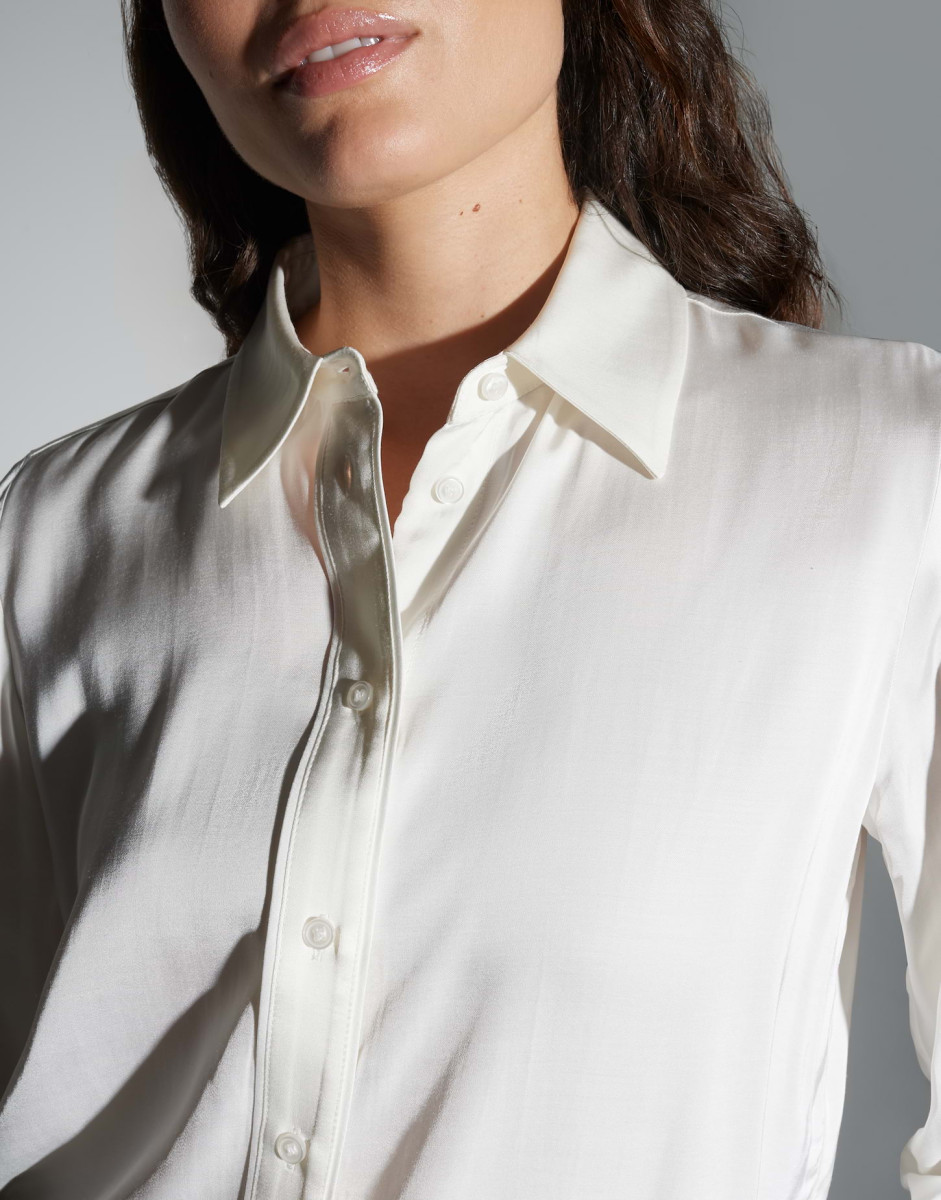 Diese klassische Bluse besticht durch ihr fließendes, seidiges Material, das ihr einen luxuriösen Fall und eine elegante Optik verleiht. Der gerade Schnitt und die durchgehende Knopfleiste unterstreichen den zeitlosen Business-Look. Mit ihrem klassischen Kent-Kragen und den langen Ärmeln mit Manschetten ist sie die perfekte Wahl für formelle Anlässe oder das Büro. Das leichte Gewebe sorgt für ein angenehmes Tragegefühl und macht dieses Oberteil zu einem vielseitigen Essential, das sich sowohl elegant als auch lässig kombinieren lässt.