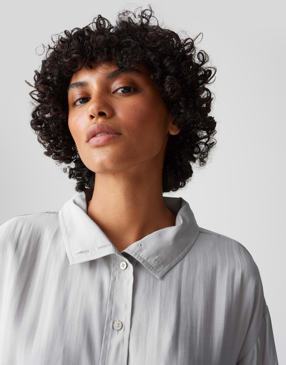 Verleihe deinem Look eine elegante Note mit diesem modischen Blusenshirt in zartem Grau. Das fließende Material sorgt für einen edlen, modernen Look, während der Hemdkragen und die langen Ärmel klassische Akzente setzen. Der Tunnelzug am Saum lässt sich individuell anpassen und sorgt für eine schlanke Silhouette, die das Blusenshirt besonders vielseitig macht.
