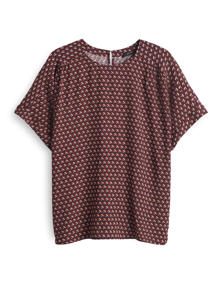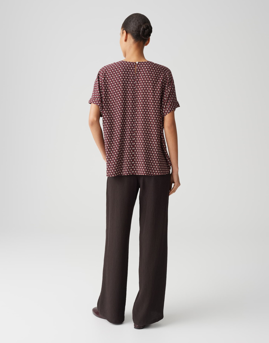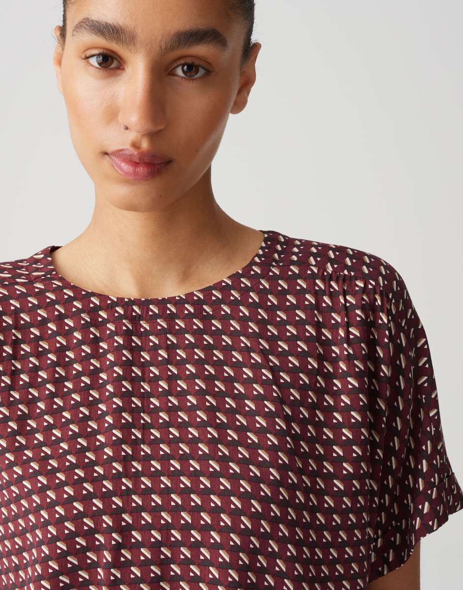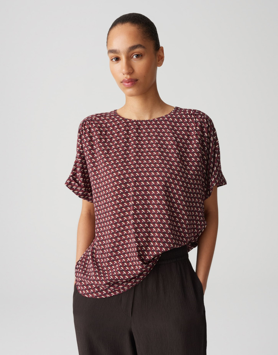 Dieses feminine Blusenshirt überzeugt mit seiner weich fließenden Webware und einem modischen All-Over-Print. Die weit geschnittene Passform mit leicht ausgestelltem Schnitt sorgt für angenehme Bewegungsfreiheit und einen luftigen Fall. Überschnittene Kurzärmel mit dekorativem Aufschlag und ein Faltendetail an der Schulternaht verleihen dem Design eine elegante Note. Der Rundhalsausschnitt wird im Rücken durch einen feinen Perlmuttknopf mit Öse ergänzt – ein stilvolles Detail mit praktischer Funktion.