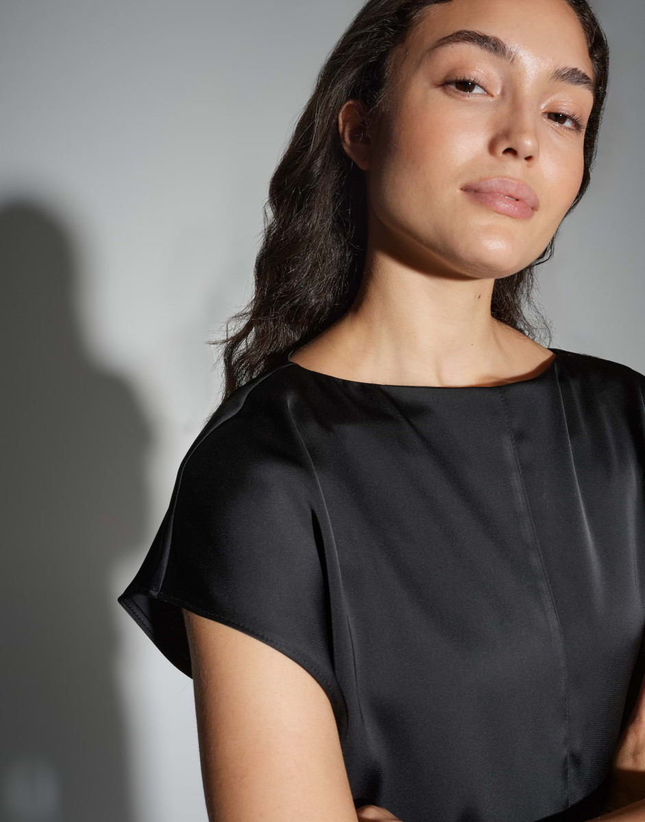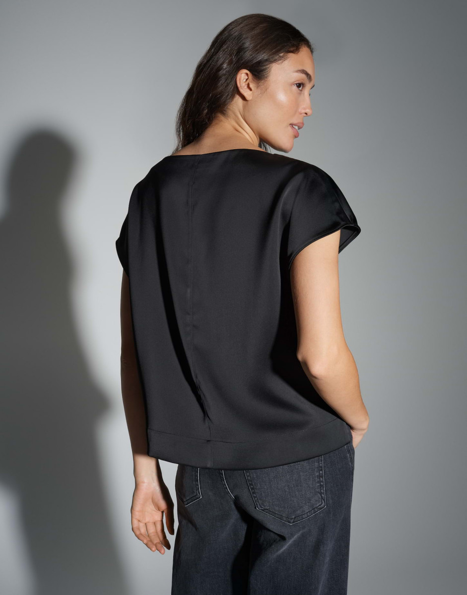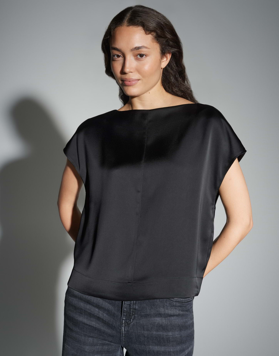 Dieser fließende Damen-Top überzeugt durch seine lockere Passform und den minimalistischen, geradlinigen Schnitt. Das hochwertige Material umspielt sanft die Figur und bietet einen angenehmen Tragekomfort den ganzen Tag über. Mit seinem weiten, eleganten U-Boot-Ausschnitt und den kurzen, überschnittenen Ärmeln präsentiert sich dieses Oberteil als vielseitiges Basic, das sich ideal für schlichte Büro-Looks oder elegante Abend-Outfits kombinieren lässt. Die feine Teilungsnaht in der vorderen Mitte sorgt für eine subtile Struktur. Dieses zeitlose Kleidungsstück ist ein unverzichtbarer Allrounder für eine stilvolle Garderobe.