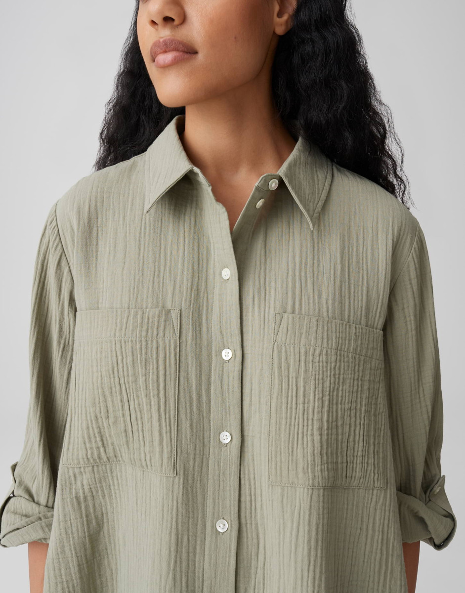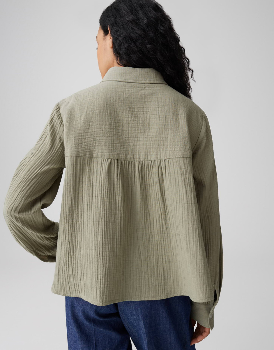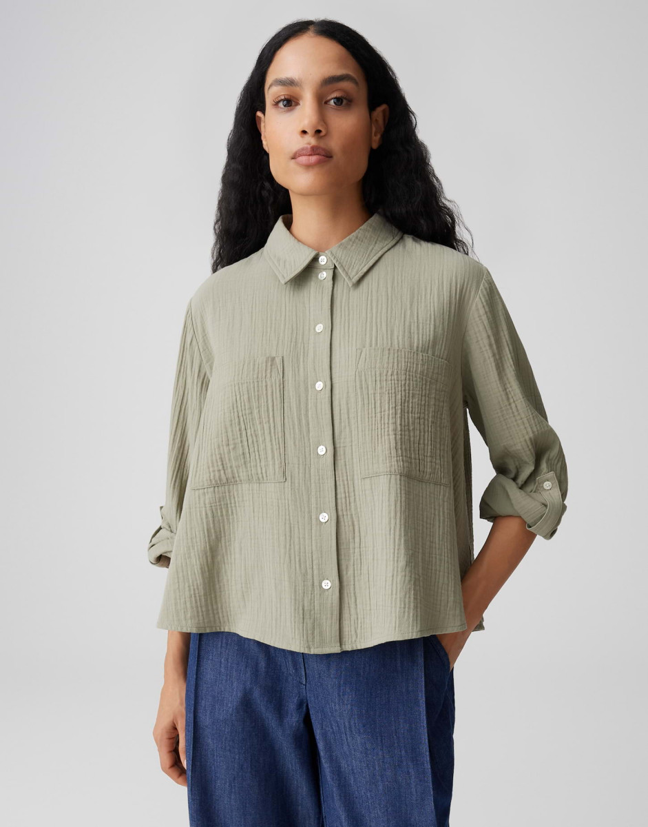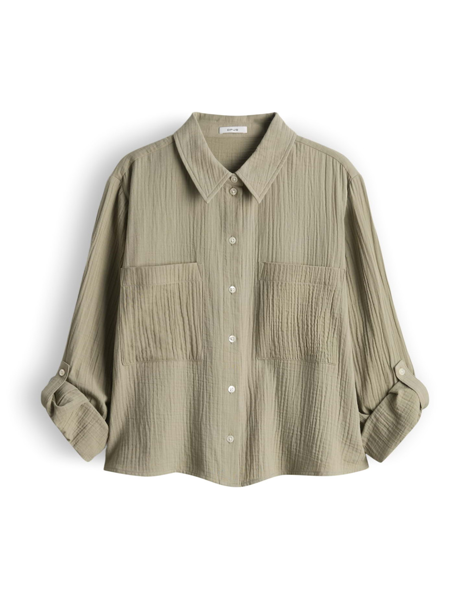 Die weite Bluse Fralea überzeugt mit einem leicht ausgestellten Schnitt und langen Ärmeln mit Aufschlag und Riegel, die eine lockere, feminine Silhouette erzeugen. Typische Details wie Hemdblusenkragen, aufgesetzte Brusttaschen, kleine Falten unter der Passe und eine durchgehende Knopfleiste mit Perlmuttknöpfen verleihen dem Modell eine elegante Note. Der Crinkle-Effekt, der weiche Griff und der fließende Fall der Webware sorgen für ein angenehmes Tragegefühl; die Rückenlänge beträgt ca. 58 cm (bei Größe 36) und das Teil enthält nichttextile Teile tierischen Ursprungs.Lief.-Art-Nr: 10549910379106