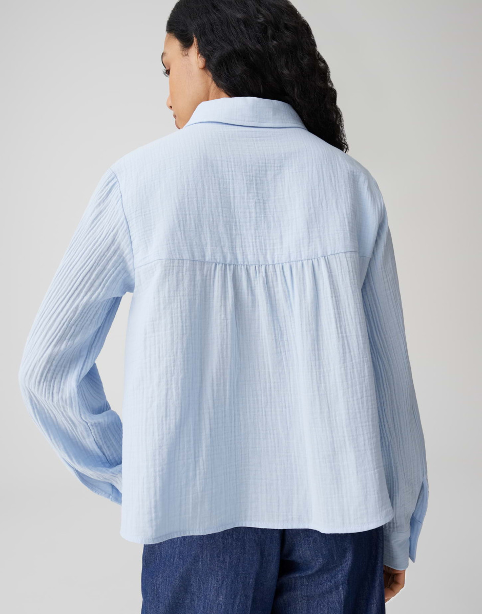 Die weite Bluse Fralea überzeugt mit einem leicht ausgestellten Schnitt und langen Ärmeln mit Aufschlag und Riegel, die eine lockere, feminine Silhouette erzeugen. Typische Details wie Hemdblusenkragen, aufgesetzte Brusttaschen, kleine Falten unter der Passe und eine durchgehende Knopfleiste mit Perlmuttknöpfen verleihen dem Modell eine elegante Note. Der Crinkle-Effekt, der weiche Griff und der fließende Fall der Webware sorgen für ein angenehmes Tragegefühl; die Rückenlänge beträgt ca. 58 cm (bei Größe 36) und das Teil enthält nichttextile Teile tierischen Ursprungs.Lief.-Art-Nr: 10549910379106
